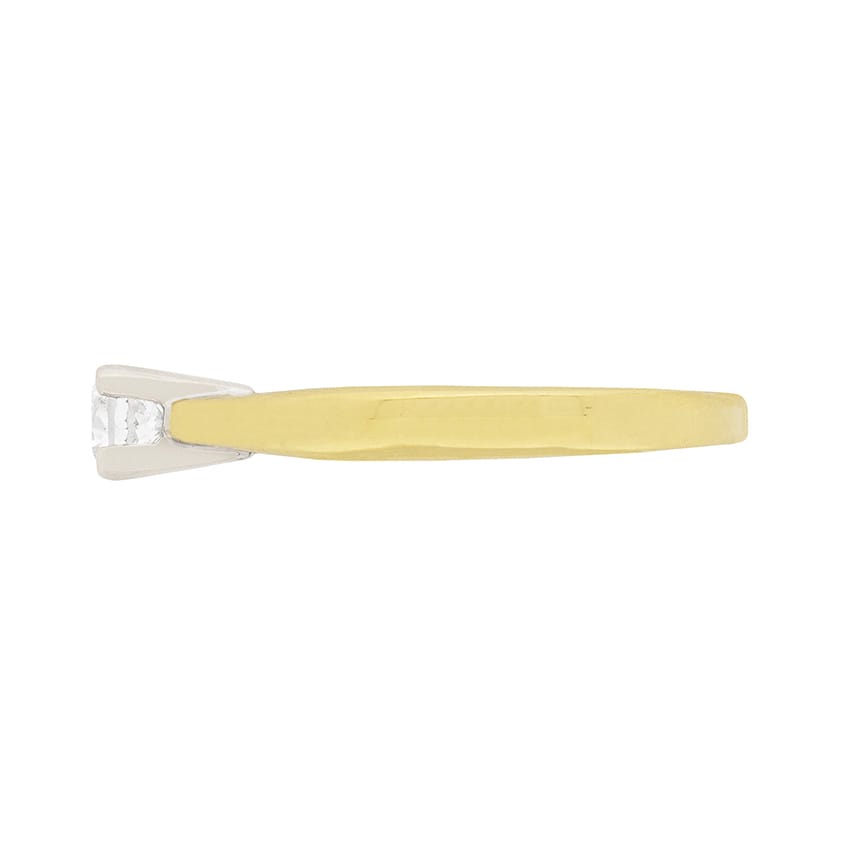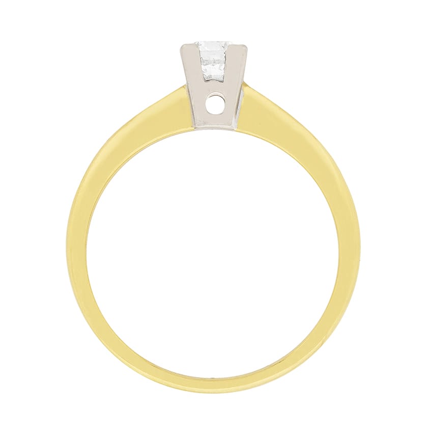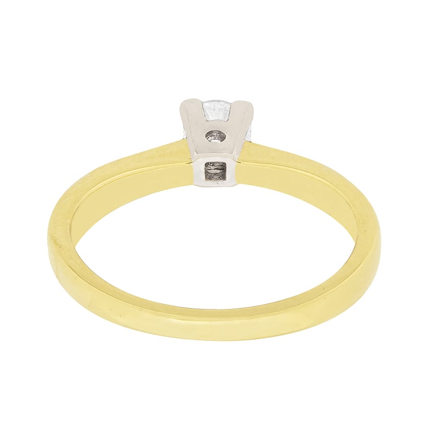 This classic solitaire features a 0.30 carat round brilliant cut diamond within a four claw setting. The diamond is estimated as F in colour and VS1 in clarity. The collet has been made in 18 carat white whilst the shank has been made in 18 carat yellow gold.