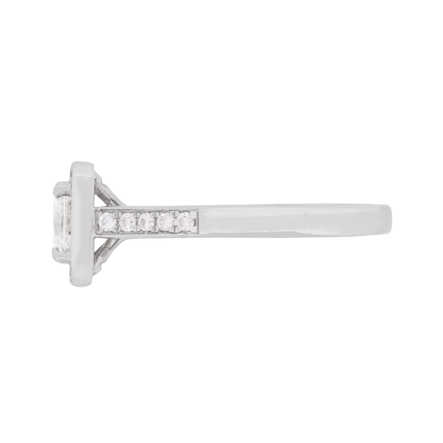 This modern ring features a centre princess cut diamond as it’s main feature. The dazzling diamond weighs 0.70 carat and has been certificated by IGI as an F colour and SI1 clarity stone. It is claw set with a halo of round brilliant diamond also cascading down the shoulders. They match the princess cut for quality and have a combined weight of 0.30 carat. It is classic in style, and would like beautiful on any wearer. The metal is all platinum.