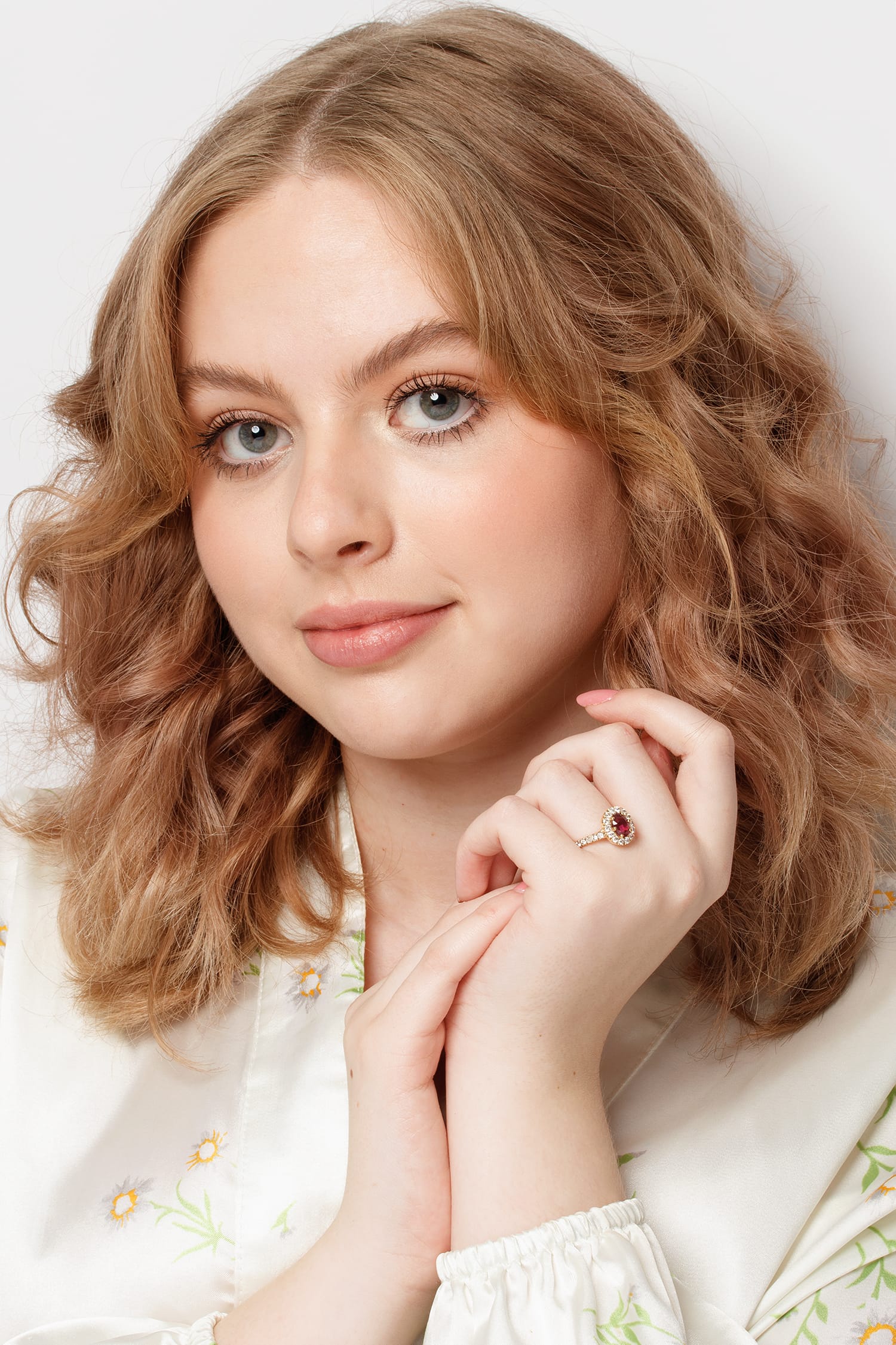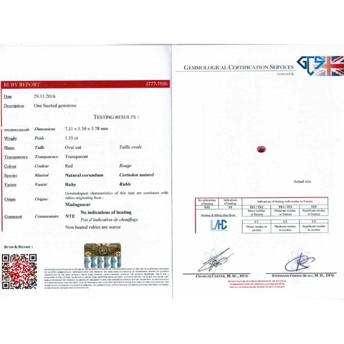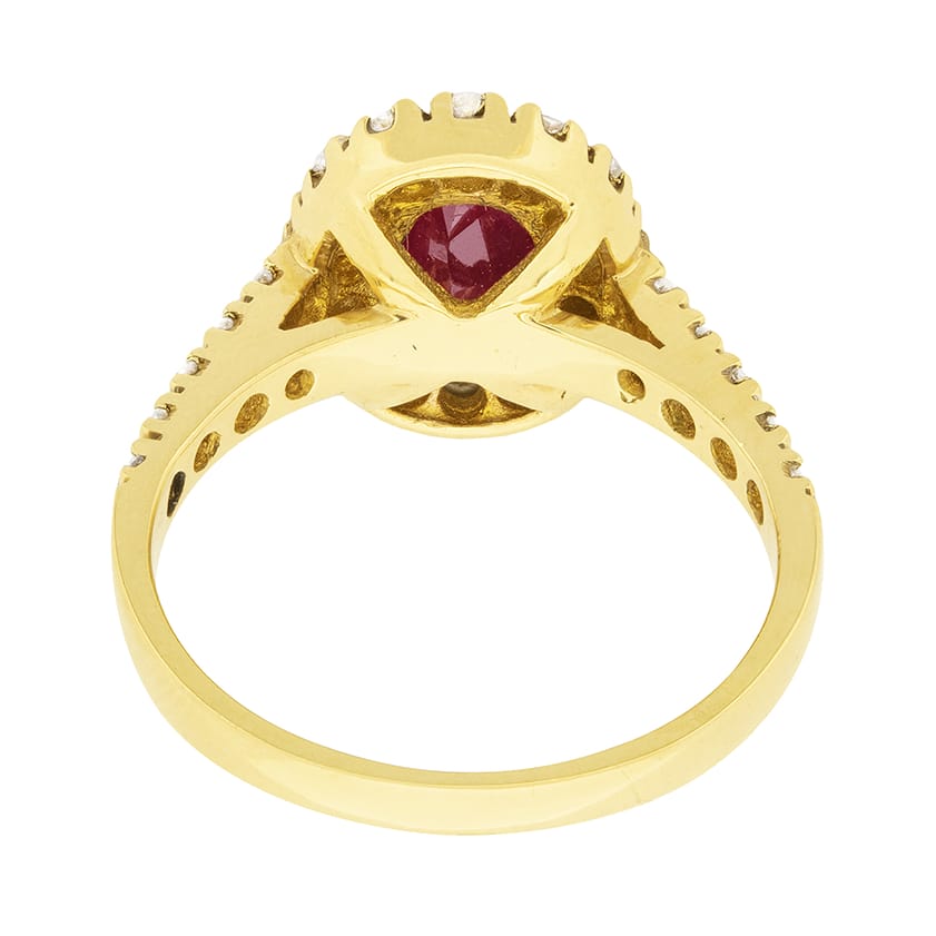 This modern piece of jewellery has a stunning centre ruby, which has been certified by GCS. It is 1.35 carat and is a natural ruby, with no heat treatment. It is surrounded by a halo of round brilliant diamonds.