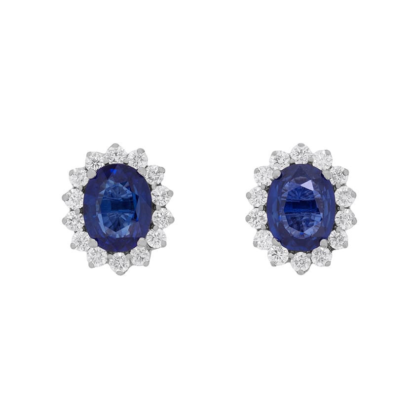 These stunning halo earrings have luscious deep blue Sapphires are the stars of the show. Each weighing 2.00 carats, the Sapphires are wonderfully highlighted by a halo of diamonds. The diamonds are beautiful round brilliants, with an estimated colour grade of G and clarity VS.