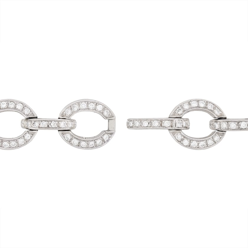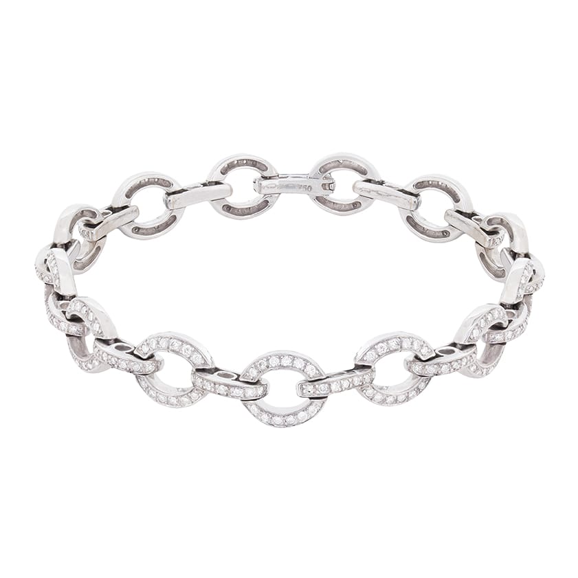 This 18 carat white gold diamond bracelet is a modern piece, featuring a total of 2.60 carat’s of diamonds. The sparkling round brilliant diamonds are estimated as G in colour and VS in clarity and are all grain set within the oval patterning. The link style is highly desirable and this design is suitable for every day wear, or on that special occasion!