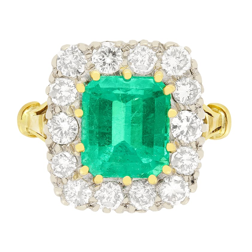 A lustrous 2.60 carat Emerald features central to this vintage cluster ring. The emerald cut stone has been firmly set in place with 18 carat yellow gold claws. The surrounding halo features 14 round brilliant diamonds, totalling to 0.70 carat. The diamonds have been graded G in colour and VS to SI in clarity. To help the diamonds look their absolute best the halo has been crafted from 18 carat white gold. Split shoulders lead down into the band of 18 carat yellow gold which finishes off the ring beautifully.