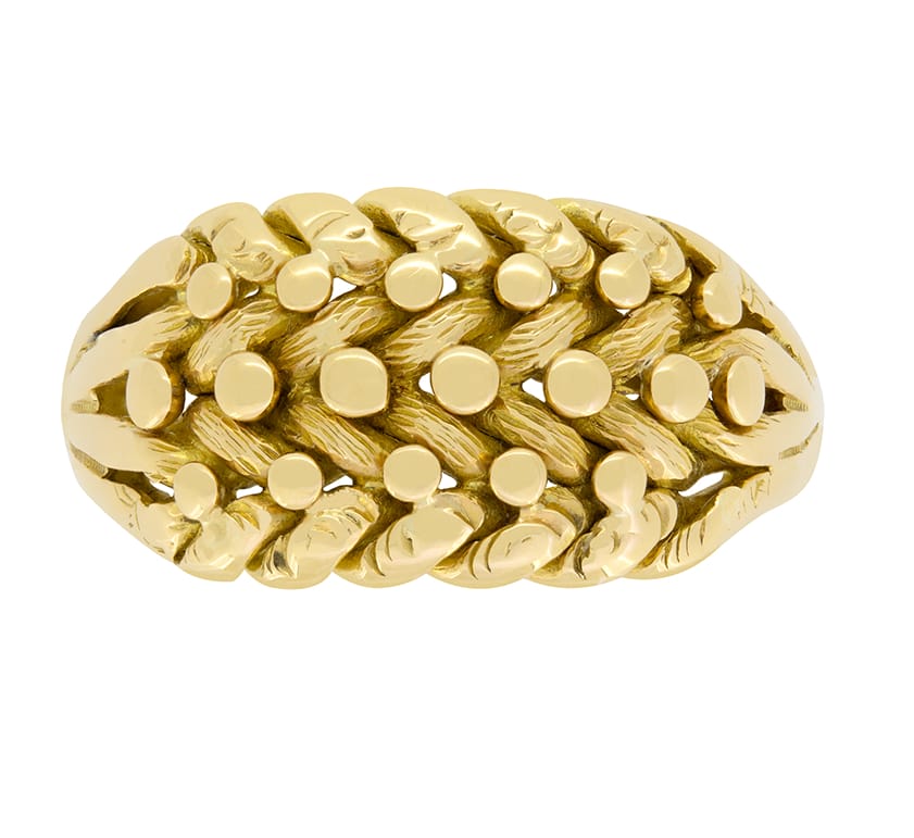 Crafted circa 1914, this gents Keeper ring has been crafted in 18 carat yellow gold. An intricate woven pattern, 11.3mm in width tapers down into a simple band making this impressive ring very wearable. The giving of a keeper ring is said to have represented that the receiver is worth keeping.