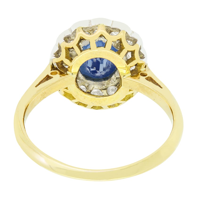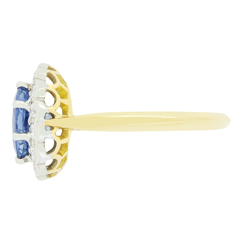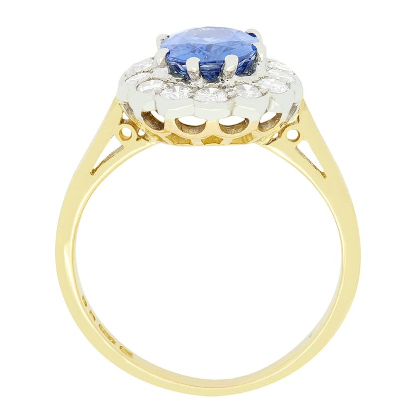 A mesmerising cornflower blue sapphire takes centre stage in this vintage cluster ring. The oval cut stone weighs 1.50 carat and is expertly claw set into 18 carat white gold. Surrounding the sapphire a halo of round brilliant diamonds sparkle. Totalling 0.56 carat the diamond match in quality, with a colour of H and a clarity of SI. The 18 carat white gold head sits upon a basket and band of contrasting 18 carat yellow gold, the mis of metals complementing blue of the sapphire beautifully.