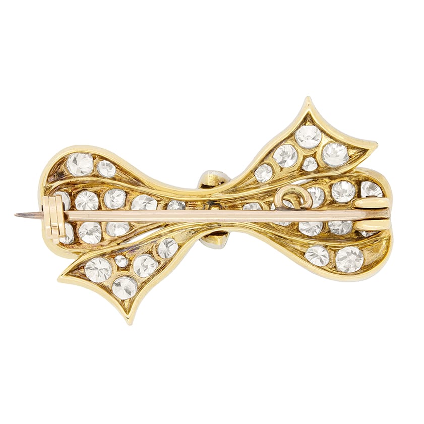 This gorgeous Art Deco brooch is a whimsical bow shape, adorned with an assortment of grain-set diamonds totalling 1.70 carats. The diamonds are a mix of old cut and round brilliant, all of which match in quality with a grading of F in colour and VS in clarity. The brooch is crafted from platinum, while the back and pin are made from 18 carat yellow gold. It’s a beautiful piece that perfectly captures Art Deco era.