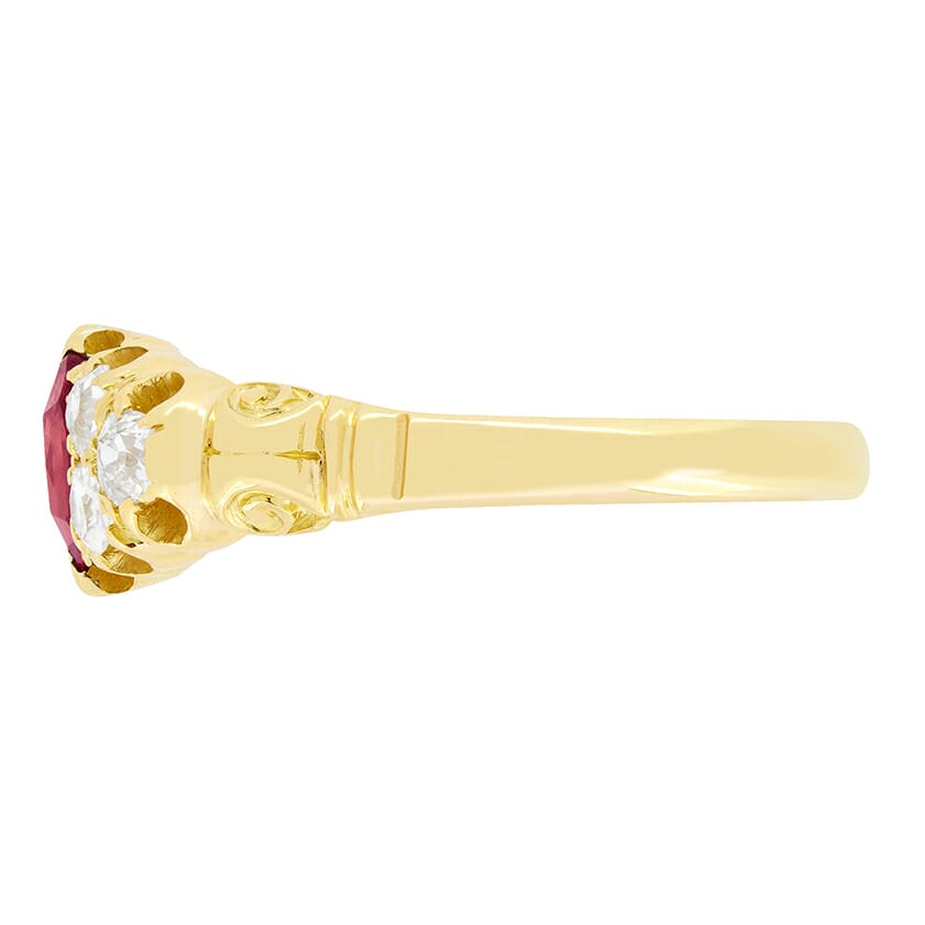 This ring from the 1880s boasts a natural vivid red ruby centrepiece flanked by three 0.10 carat old cut diamonds on either side. The lustrous ruby weighs 1.00 carat and securely claw set into yellow gold. The diamonds all match in colour, being graded G and range in clarity from VS to SI. The Victorian ring is beautifully hand crafted from 18 carat yellow gold and features elegant detailing down each shoulder.