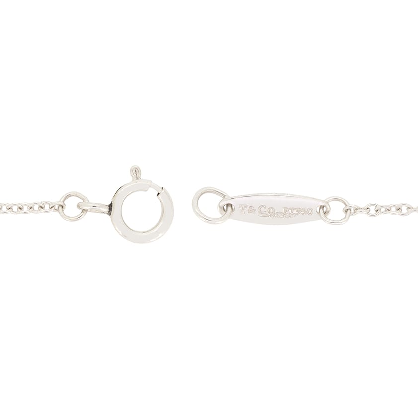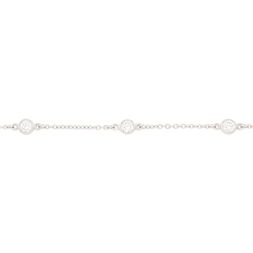 This Beautiful ‘Diamonds by the yard’ bracelet is from Tiffany & Co’s ‘Elsa Peretti’ collection. It features rub over set diamonds postioned at different points across the length of the chain. The six round brilliant diamonds total 0.31 carat and are of High quality as you’d expect from Tiffany & Co. matching in colour at F and in clarity at VS. The 18cm chain connecting the diamonds is crafted from platinum and features the Tiffany & Co. maker’s marks on the clasp.