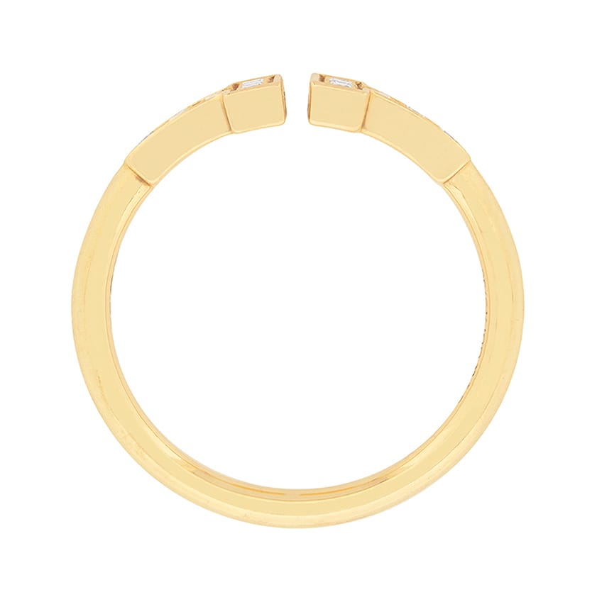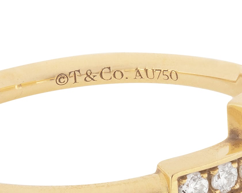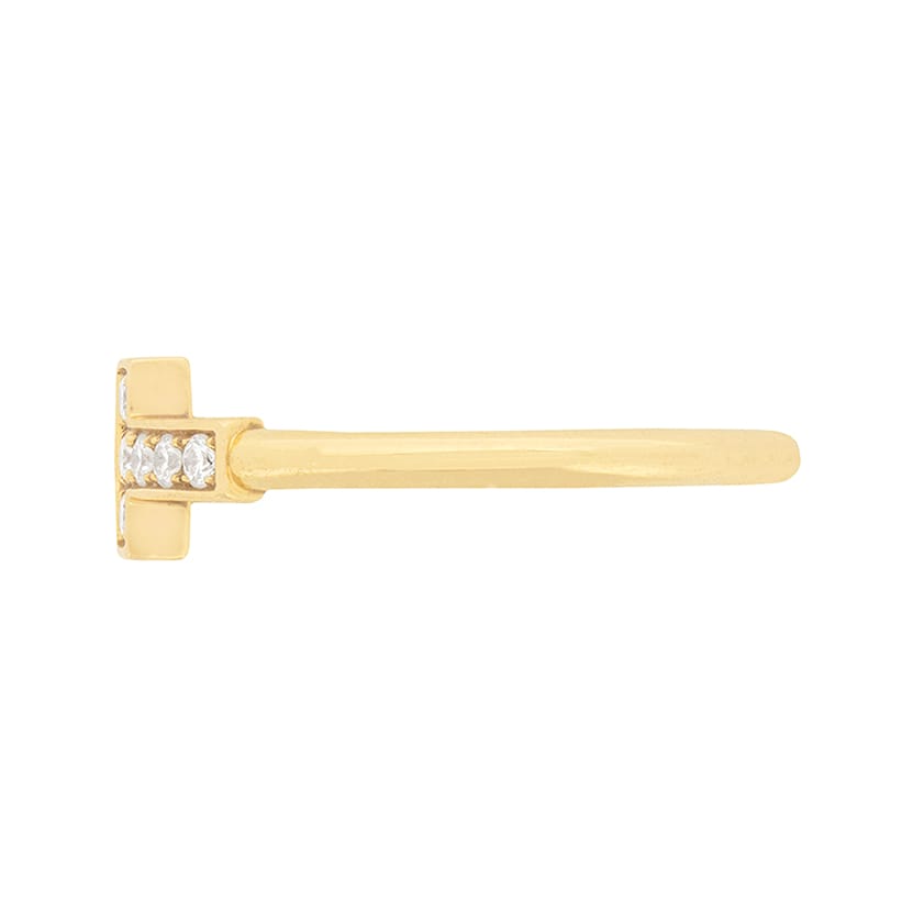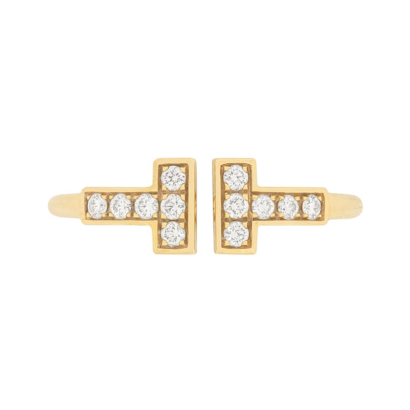 This Tiffany & Co. ring comes from their iconic ‘Tiffany T’ collection. Twelve round brilliant diamonds are set across the ‘T’ emblems. The diamonds have a total carat weight of 0.13 carat and are of high quality, with F colour and VVS clarity. Crafted in 18 carat yellow gold, the contrast between metal and diamond really helps the diamonds pop. All the original Tiffany & Co. hallmarks can be seen along the inside of the wire band. This lovely ring would make a perfect gift for that special someone.