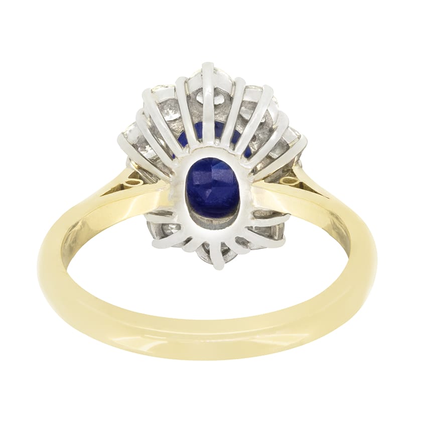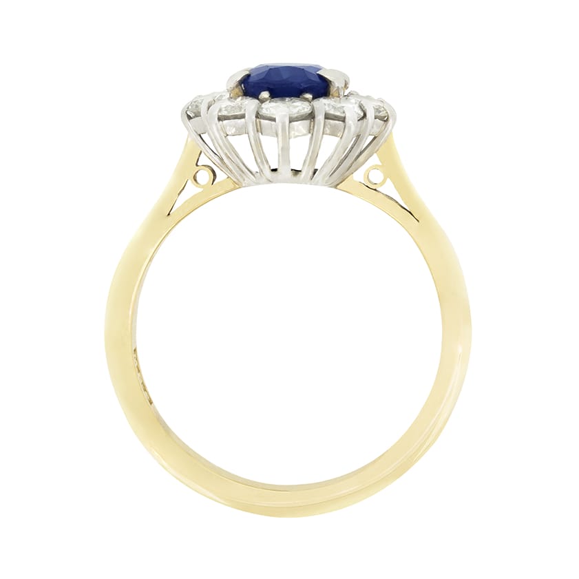 A deep blue sapphire sits at the centre of this wonderful cluster ring, hallmarked 1983. The oval cut stone weighs 1.10 carat and is expertly claw set into 18 carat white gold. Surrounding the sapphire, a halo of round brilliant diamonds sparkle. Totalling 1.00 carat, the diamonds match in quality, with a colour of G and a clarity of VS. The 18 carat wire basket work sits upon a band of contrasting 18 carat yellow gold, the mix of metals complementing the blue of the sapphire beautifully.