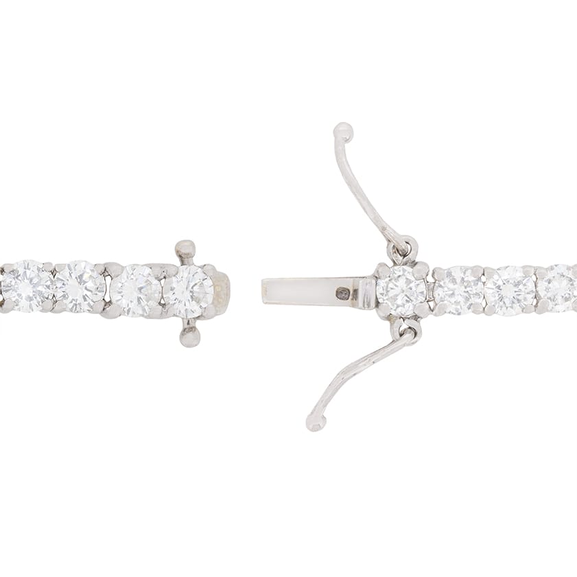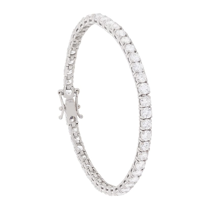 This 18 carat white gold tennis bracelet is timeless in design. It features 47 claw set diamonds which are round brilliants. They have a combined weight of 9.40 carat and they are high quality stones. Estimated as G to H in colour and VS in clarity, this bracelet is ideal for that special occasion, or simple everyday wear.