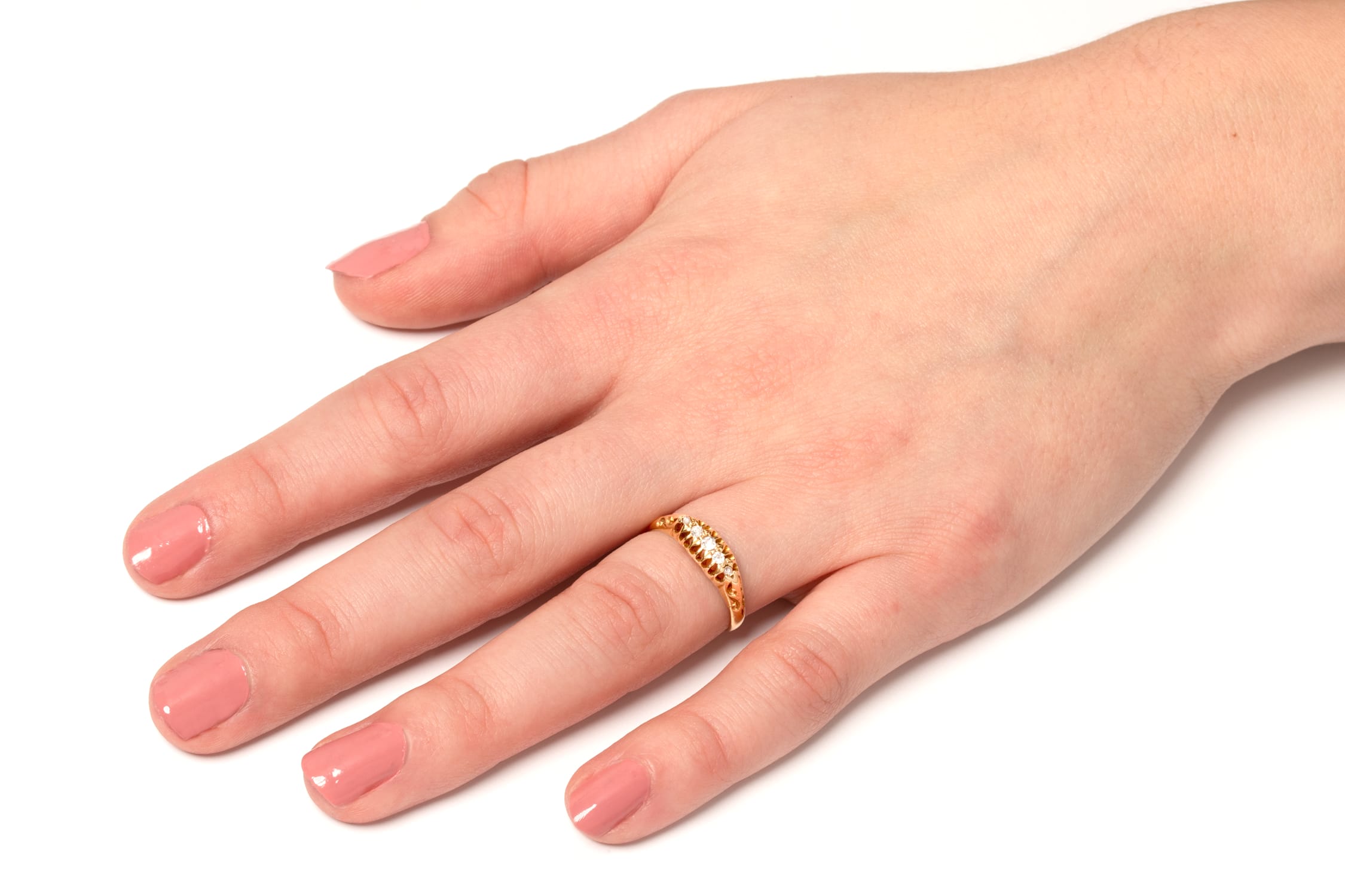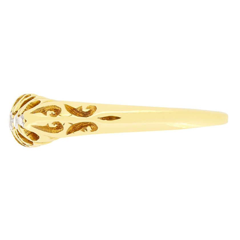 This charming antique five stone ring features hallmarks dating it to 1909. The central diamond is the largest of the collection at 0.05 carat, the flanking pair then sit at 0.03 carat with the end two diamonds at 0.01 carat a piece. Each stone is an old cut diamond with colour between G and H and clarity of SI. Across the gallery and down each shoulder wonderful decorative carving work is on display, indicative of the era. This delightful ring has been entirely crafted in 18 carat yellow gold.