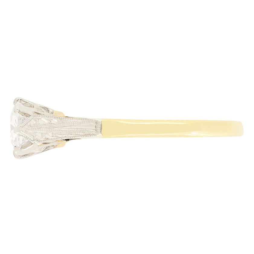 Crafted in the 1930s, this timeless solitaire ring features a single transitional cut diamond at its centre. The 0.60 carat stone has colour of I and clarity of VS. It is claw set into a platinum collet and flanked by beautiful milgrain detailing down each shoulder adding true antique style to the piece. A simple band of 18 carat yellow gold completes this classic solitaire ring.