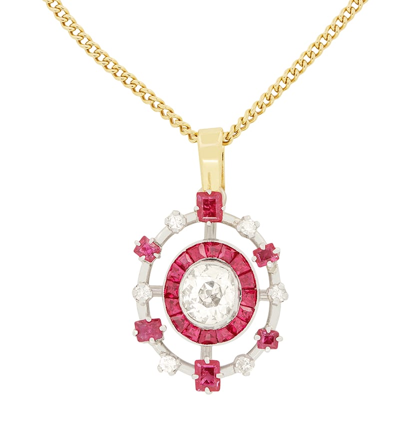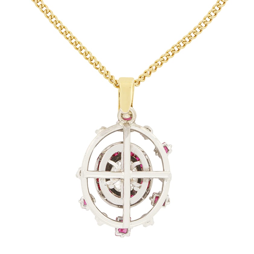 This antique target pendant is a masterpiece of 1930s elegance. At its centre sits a rub over set, old oval cut diamond weighing 0.85 carats with a colour of J and clarity of SI1 in clarity. Surrounding the central stone, halo of channel tapered baguette cut glow vibrantly. The central show piece if accented further by an additional outer ring featuring alternating emerald cut rubies and old cut diamonds. Across the pendant a total of 1.00 carat of rubies can be seen and an additional 0.36 carat in diamonds. The pendant is crafted in 18-carat white gold, suspended from an 18-carat yellow gold bail and a 20 inch chain, contrasting the pendant beautifully.