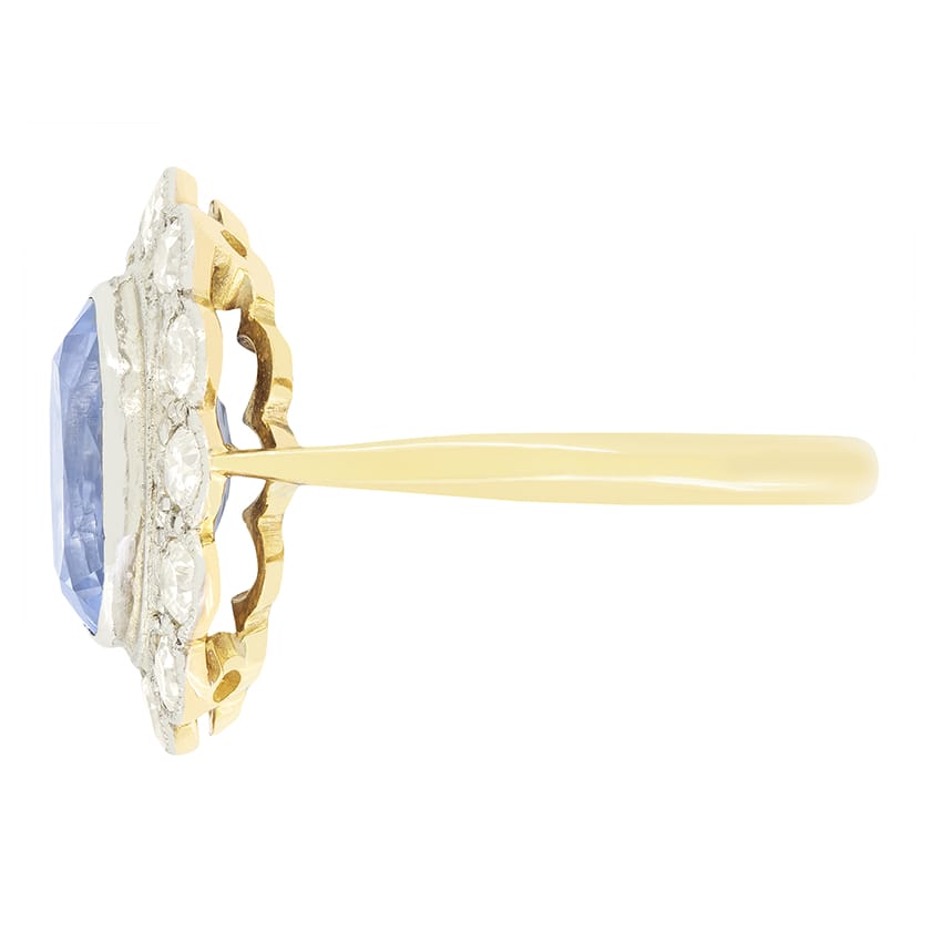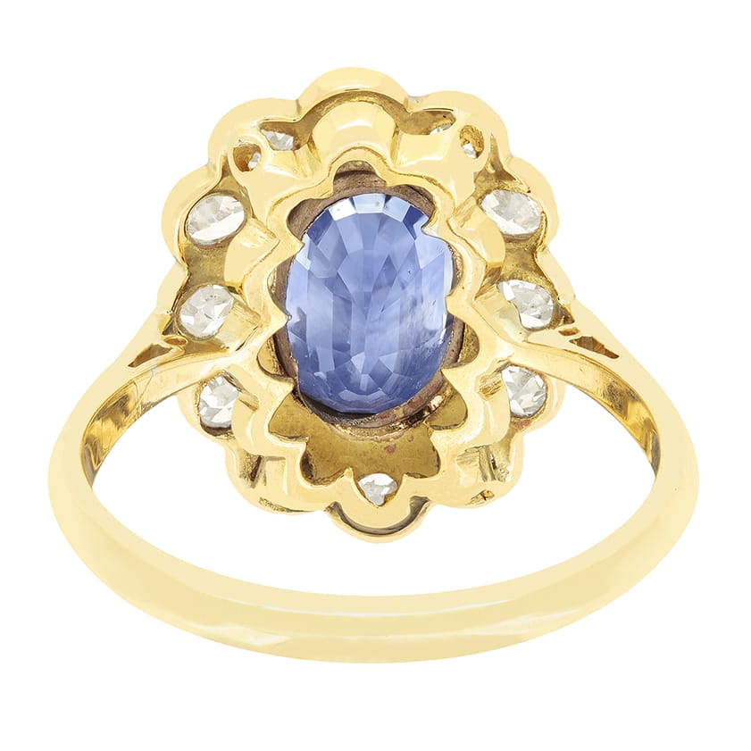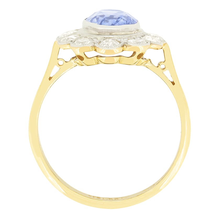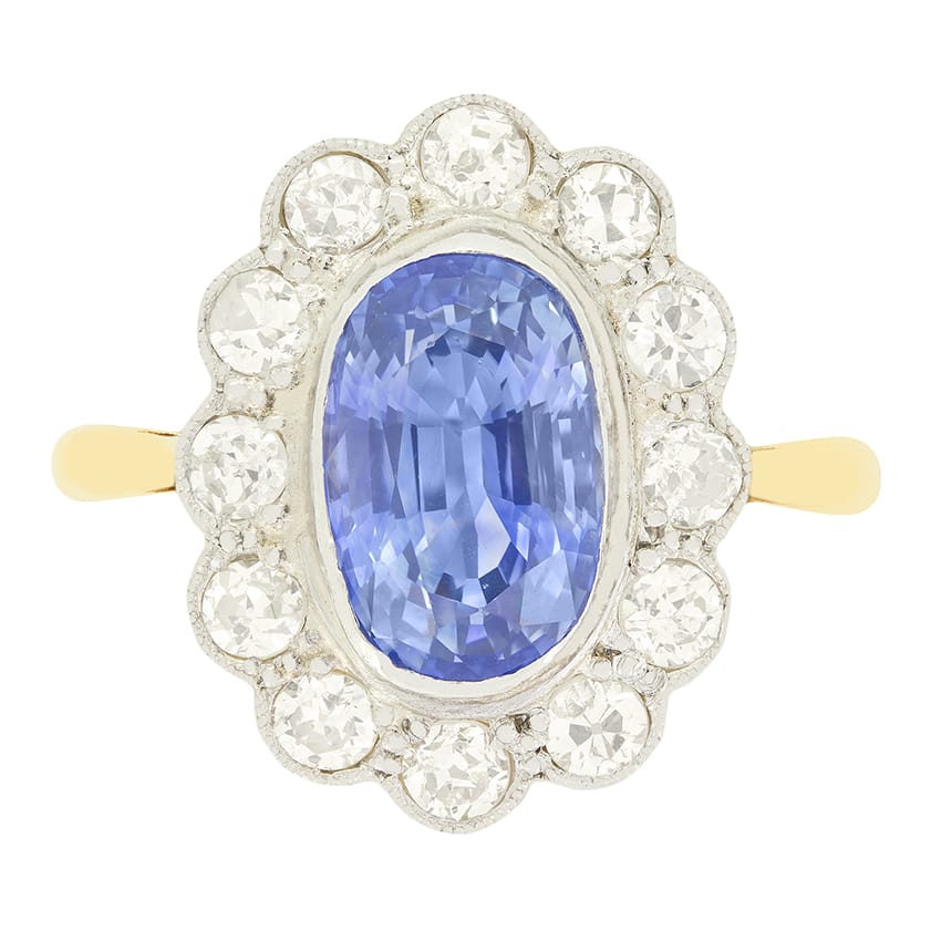 This stunning cluster ring dates back to the 1930s. At it’s heart sits an impressive 2.70 carat, cornflower blue sapphire. The sapphire is a natural stone cut in an oval shape and is rub over set into platinum. Enveloping the sapphire a ring of twelve old cut diamonds are set. Totalling 0.60 carat the diamonds match in quality at G in colour and VS in clarity. The platinum head holding each gem sits upon a hand crafted basket and band of 18 carat yellow gold completing the piece in beautiful antique style.
