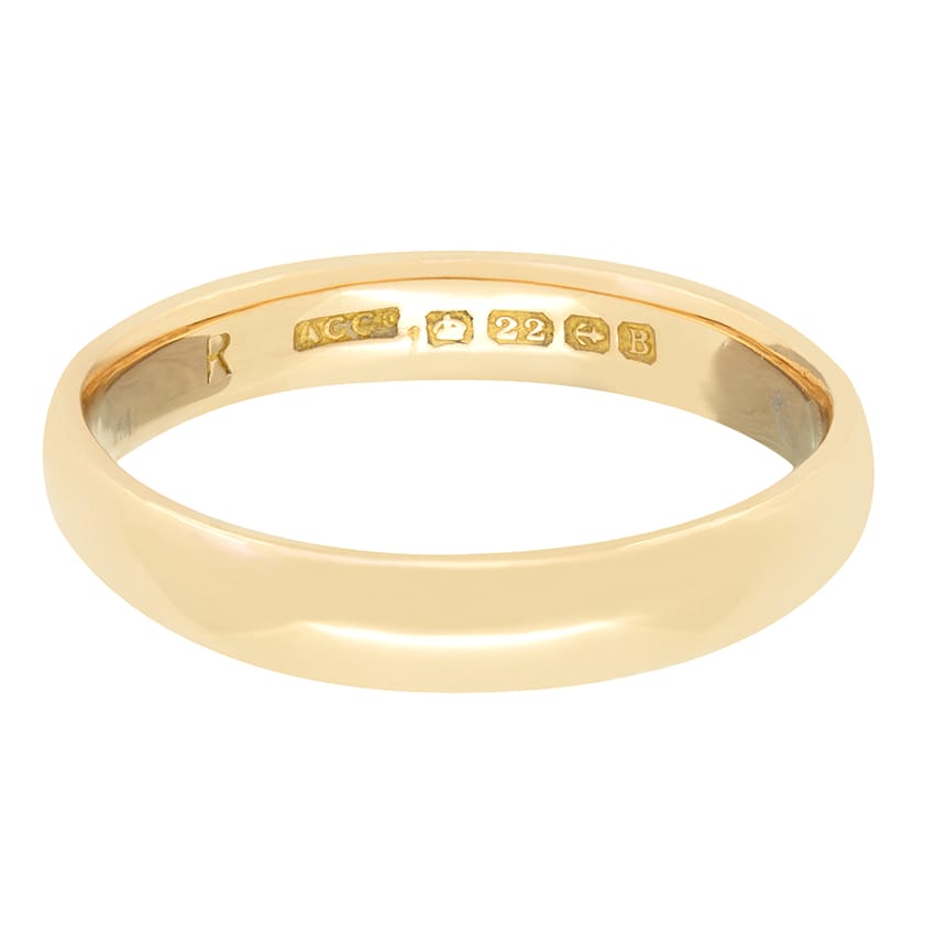 This classic antique wedding band has hallmarks dating it to 1926. The 4mm band weighs 5.8 grams and is crafted in 22 carat gold.