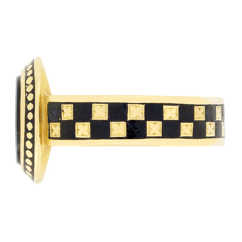 With hallmarks dating to 1914, this mourning ring features a unique chalcedony central stone. Crafted in 18 carat yellow gold, the band features a checkerboard motif created with black enamelling. Along the inside of the band, the date ‘April 2nd 1840’ can be read along with a full suite of original hallmarks.