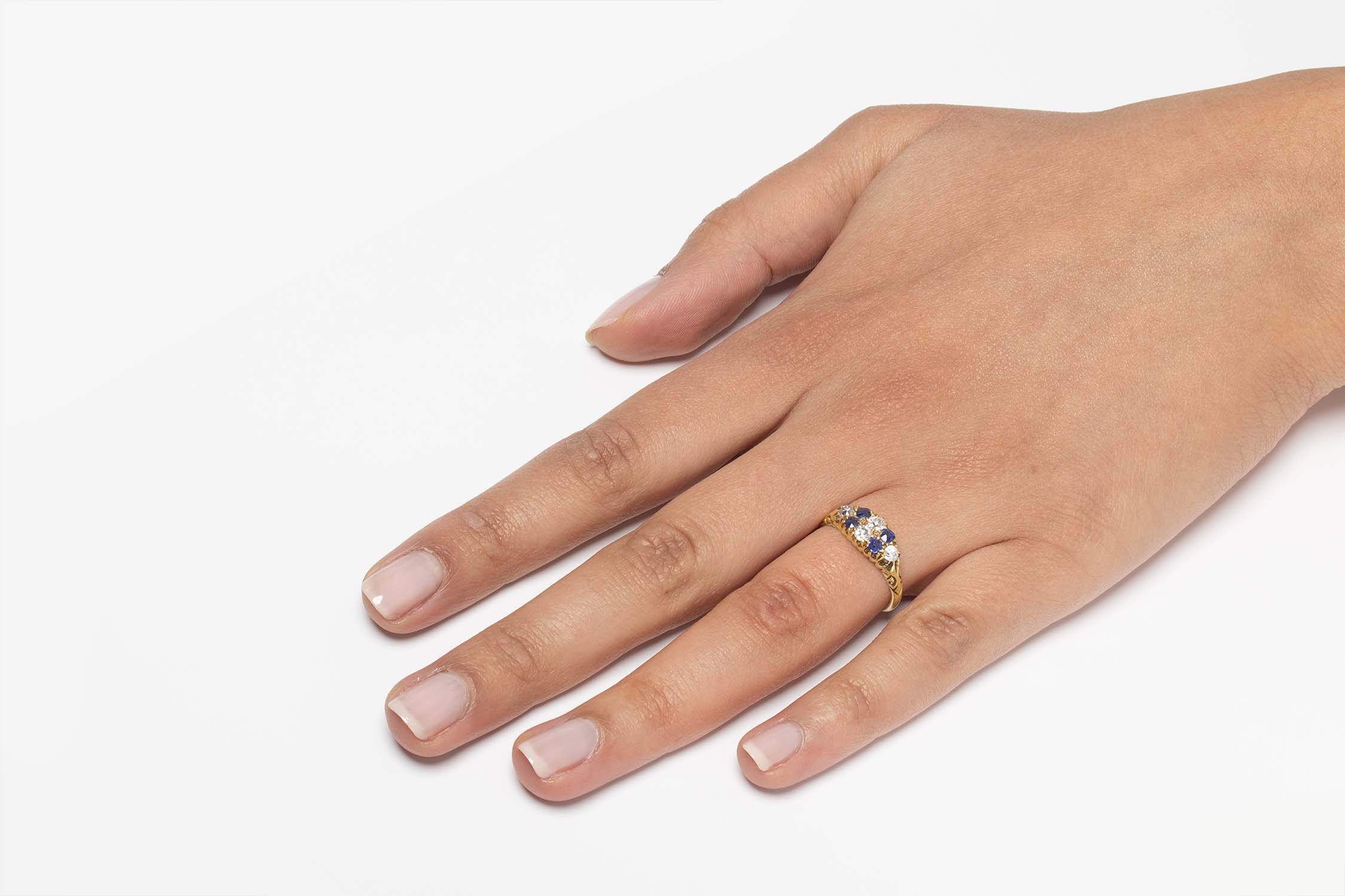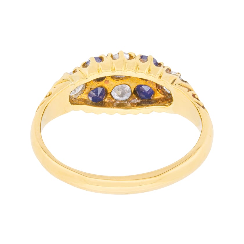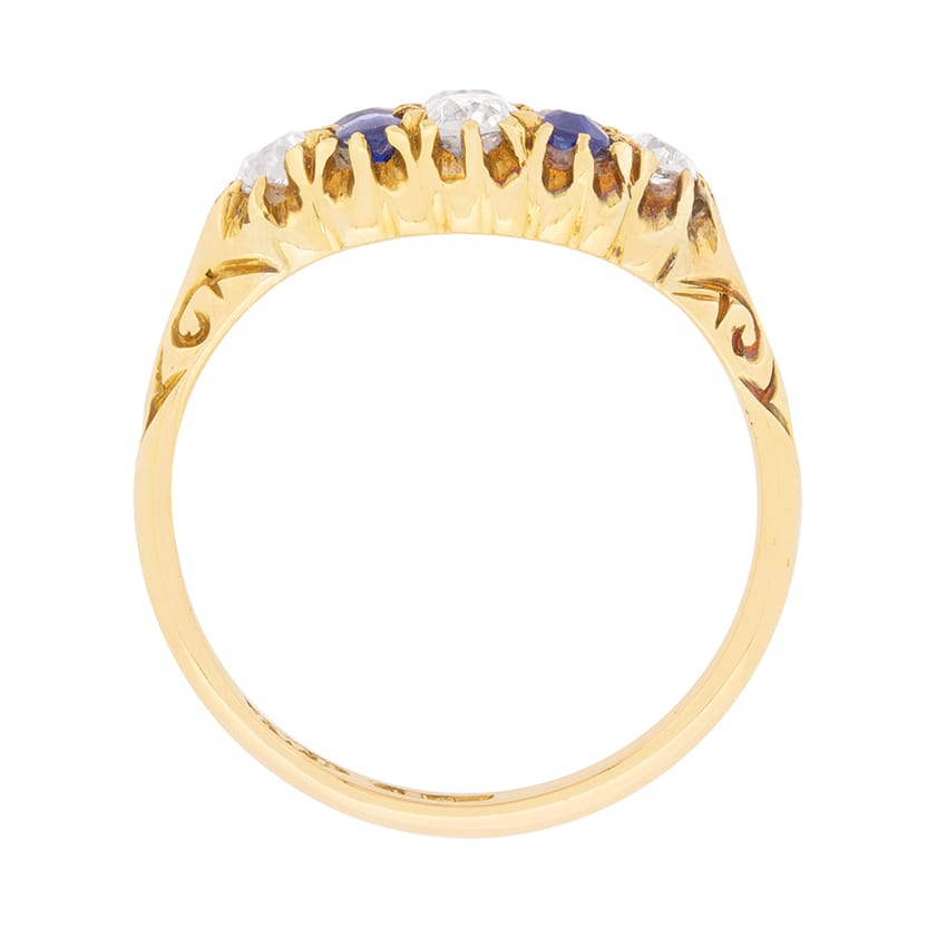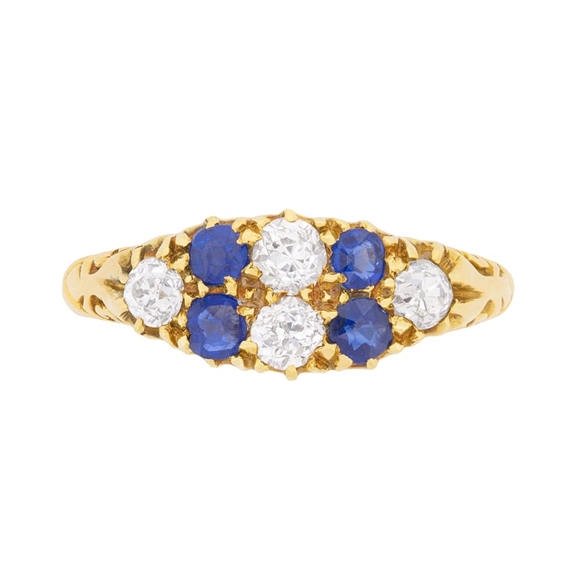 This original 1920s era diamond and sapphire cluster ring centres a pair of vertically set old cut diamonds between a pair of vertically set old cut sapphires, and a similarly-sized diamond at each shoulder. The sapphires have a combined weight of 0.40 carat, matching the diamond weight and working in perfect harmony. Handmade in 18 carat yellow gold, this antique ring is full of delightful period touches which include curving claws, a fluted gallery and engraved shoulders.