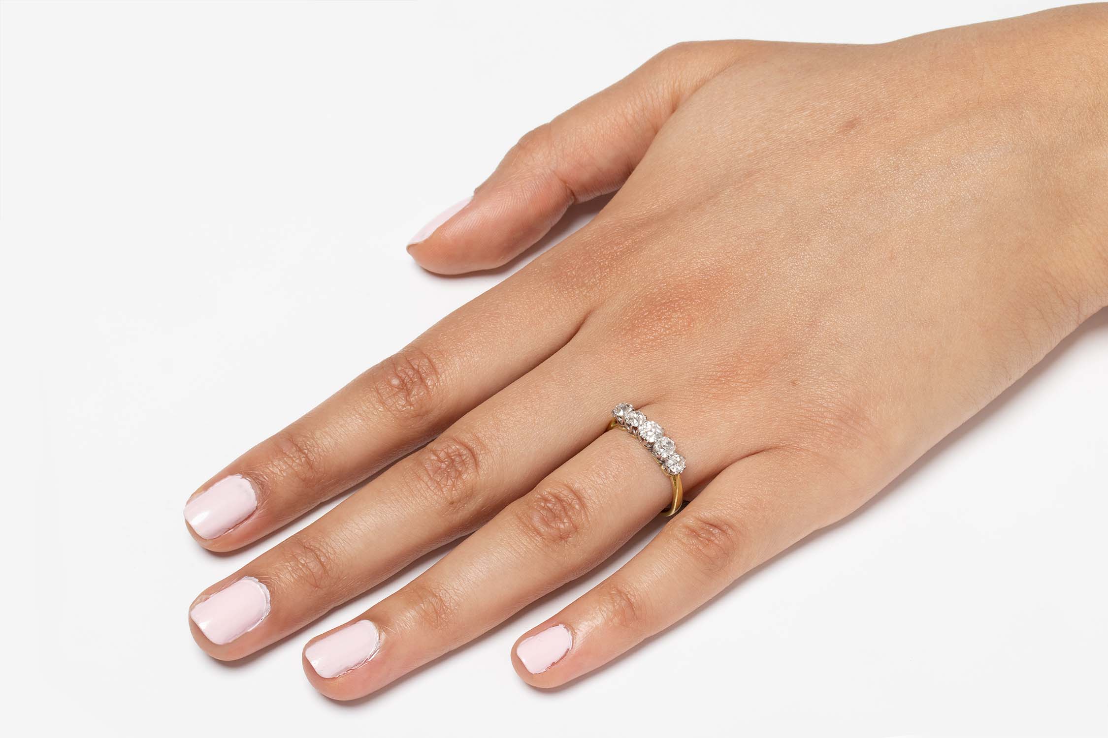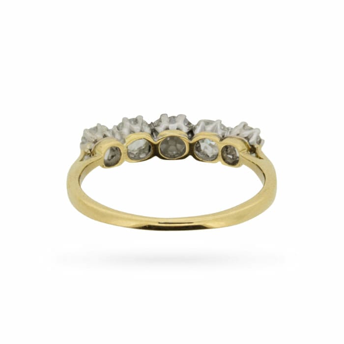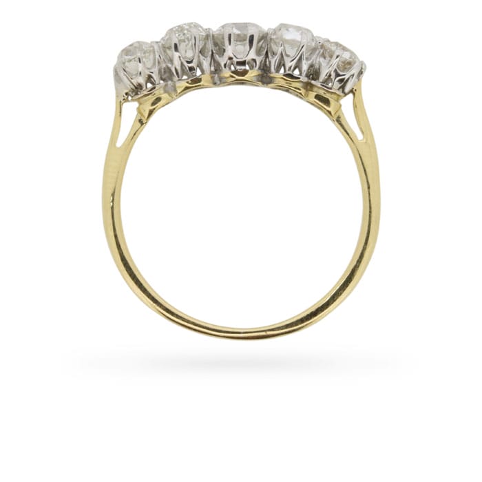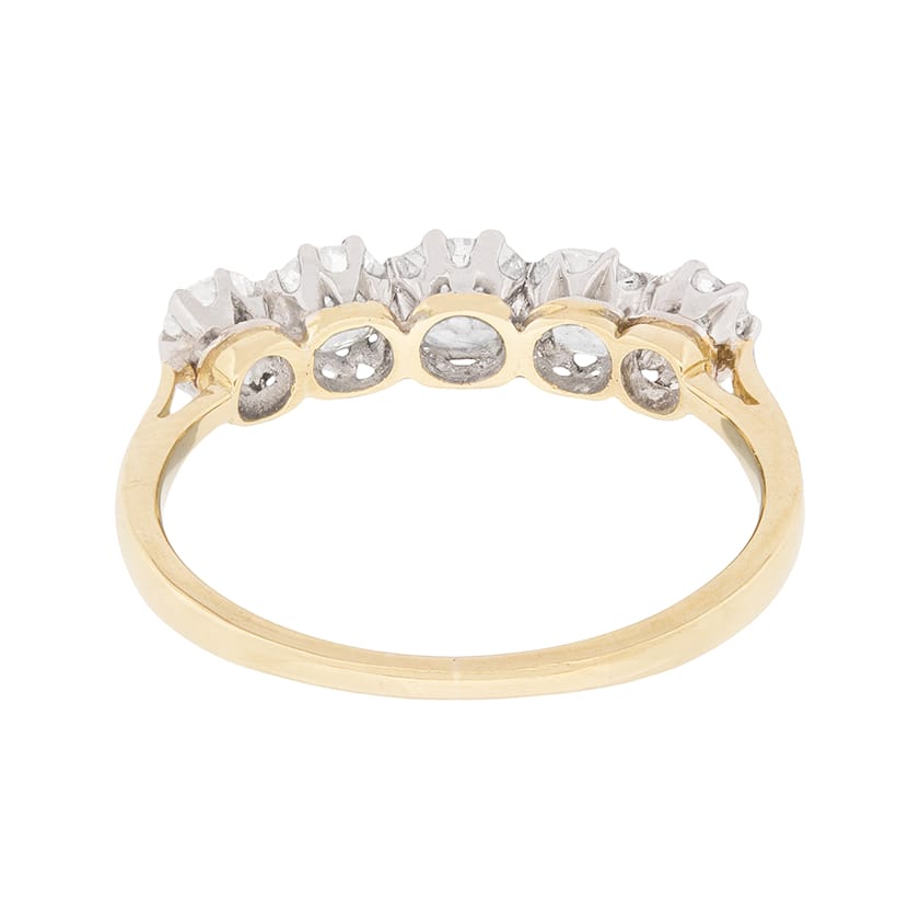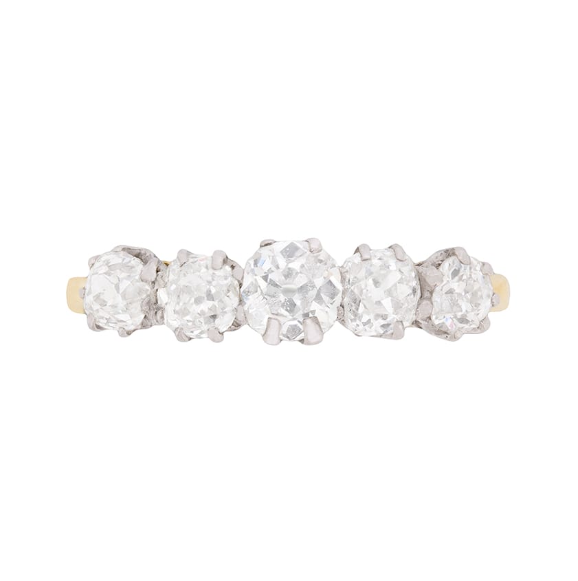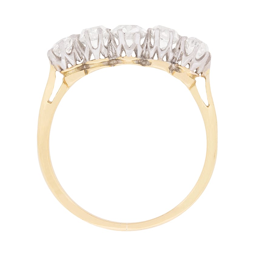 This two-tone Edwardian era five stone diamond ring showcases a lovely quintet of old cut diamonds set horizontally and graduated from centre. There is a combined weight of 1.50 carat, G in colour and VS to SI in clarity. The diamonds are claw set in their original platinum mountings, which were handmade around the turn of the twentieth century with beautiful pierced gallerywork and circular backholing, set atop an 18 carat yellow gold band.