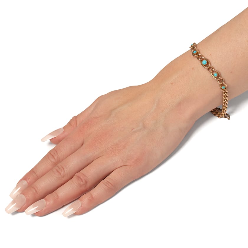 Crafted in 9 carat rose gold, this charming 1900s bracelet featured five turquoise set equally across it’s length. The 18cm bracelet weighs 6.5 grams and sits beautifully on the wrist.
