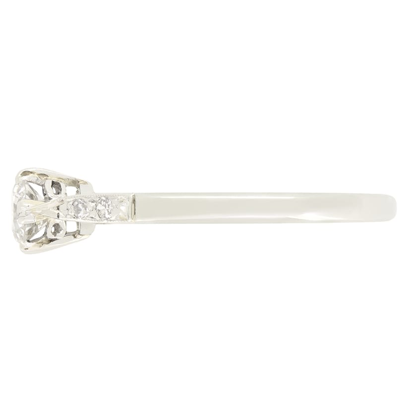 A single 0.30 carat transitional cut diamond sits central in this timeless Art Deco Solitaire ring. The diamond is of high quality, with colour of G and Clarity of VS1. Sat within platinum claws the diamond is flanked down each shoulder by four eight cut diamonds, two on either side, adding a wonderful extra sparkle. A band of 18 carat white gold completes this quintessential engagement ring style perfectly.