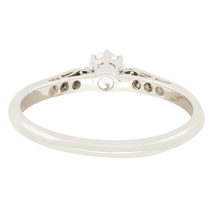 This timeless solitaire ring dates back to the roaring 1920s. A single 0.40 carat, transitional cut diamond takes centre stage, claw set into platinum. The diamond has an estimated colour of G and clarity of SI1. Down each shoulder, an additional four, eight cut diamonds shimmer for a total of 0.16 carat. Finished with a band of 18 carat white gold, this classic solitaire is one of the most traditional of engagement ring styles.