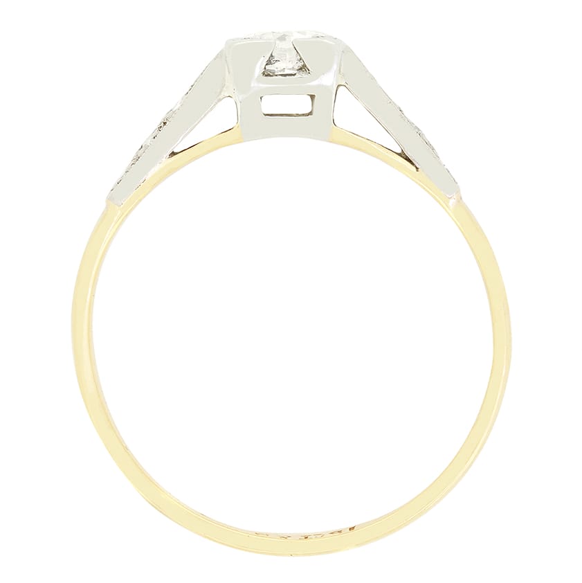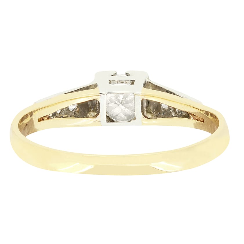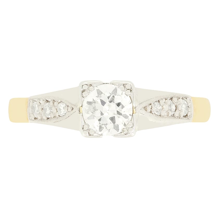 This classic diamond solitaire ring dates to the 1930s. At its centre sits a 0.40 carat transitional cut diamond. This glittering diamond is of good quality with colour of G and clarity of VS2 and is expertly claw set in a square platinum collet. Flanking the showpiece stone, two rows of diamonds flow down tapering shoulders. These platinum shoulders then sit upon a contrasting band of 18 carat yellow gold.