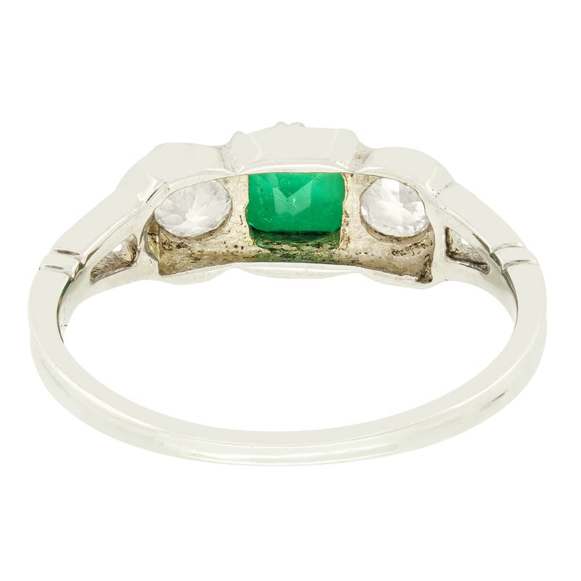 Dating back to the 1920s is this beautiful trilogy ring featuring a central emerald flanked by diamonds. The natural Emerald is a classic emerald cut stone weighing 0.40 carat. Each of the accompanying diamond weighs 0.25 carat and has a colour of G and clarity of VS2. The ring itself is entirely hand crafted in 18 carat white gold.