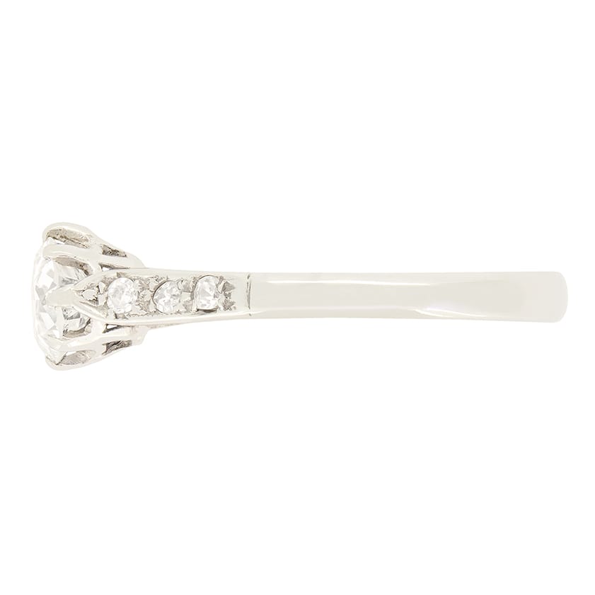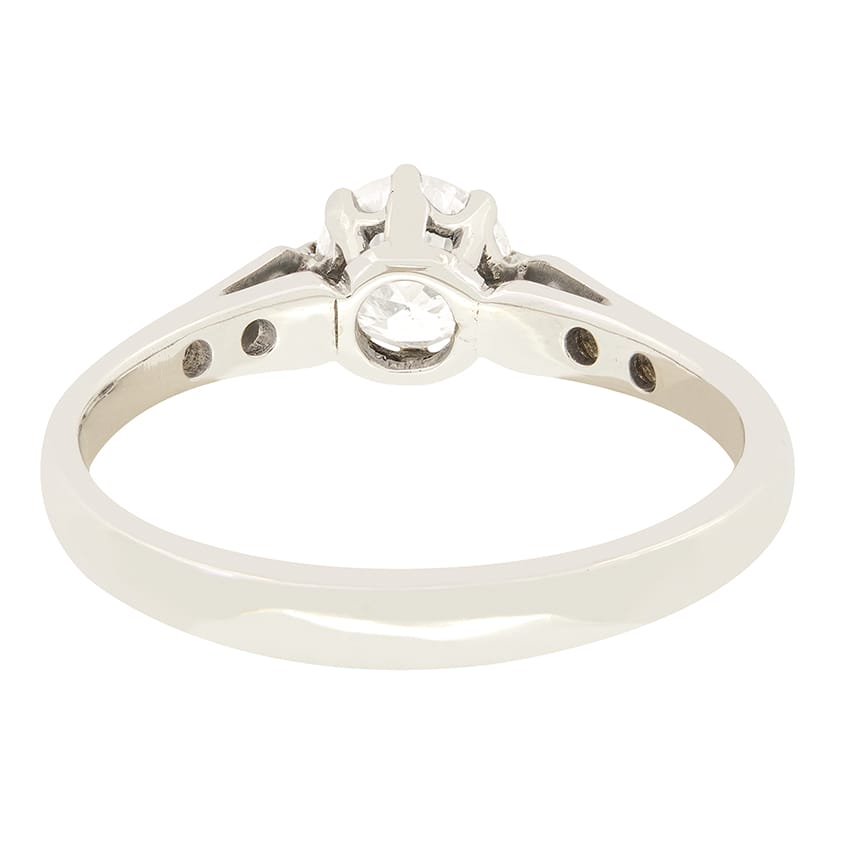 This timeless solitaire engagement ring dates back to the Art Deco era. A single 0.50 carat old cut diamond takes pride of place at its heart. Claw set into a platinum collet, the diamond which has a colour of G and clarity of SI1. Down each shoulder are a further three old cut diamonds, totalling 0.06 carat are set adding extra sparkle to this classic 1920s ring.