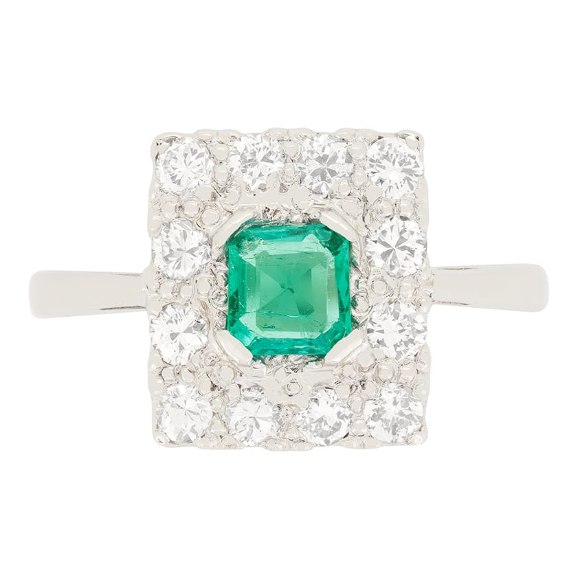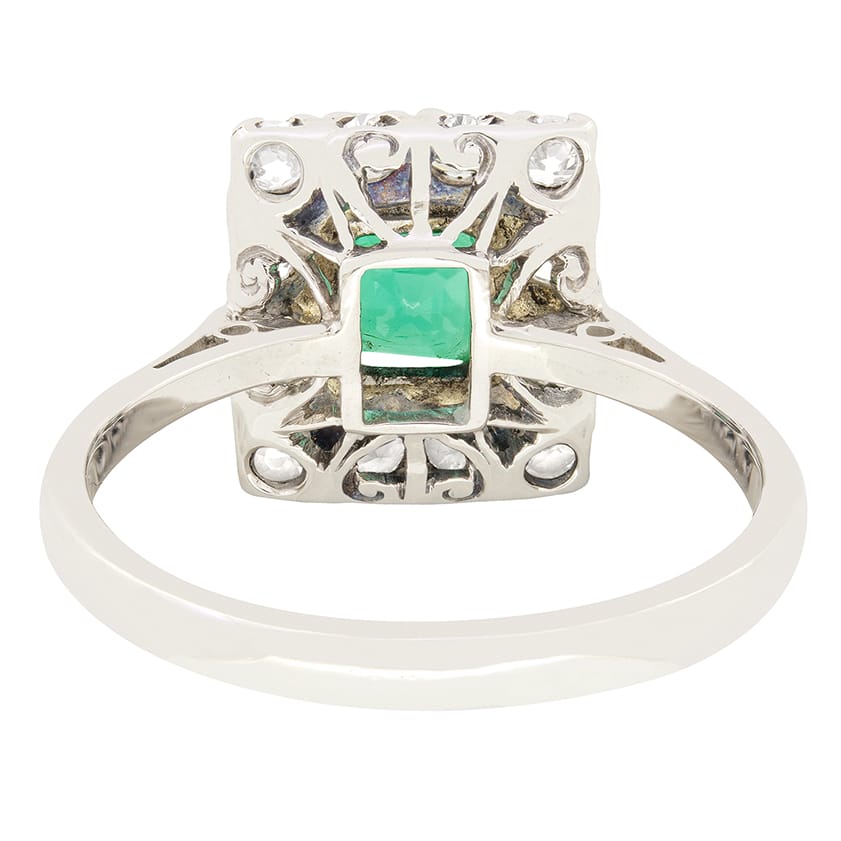 Hand crafted in the heart of the Art deco era, this stunning square cluster ring features a vivid green emerald at its centre, surrounded by transitional cut diamonds. The 0.50 carat emerald is an emerald cut stone, claw set into 18 carat white gold. The surrounding diamonds glitter within the same metal. They total 0.60 carat, with matching colour of G and clarity ranging from VS to SI. Hand crafted open basket work allows plenty of light under the stones, bringing them to life. A simple band of 18 carat white gold completes this beautiful ring.