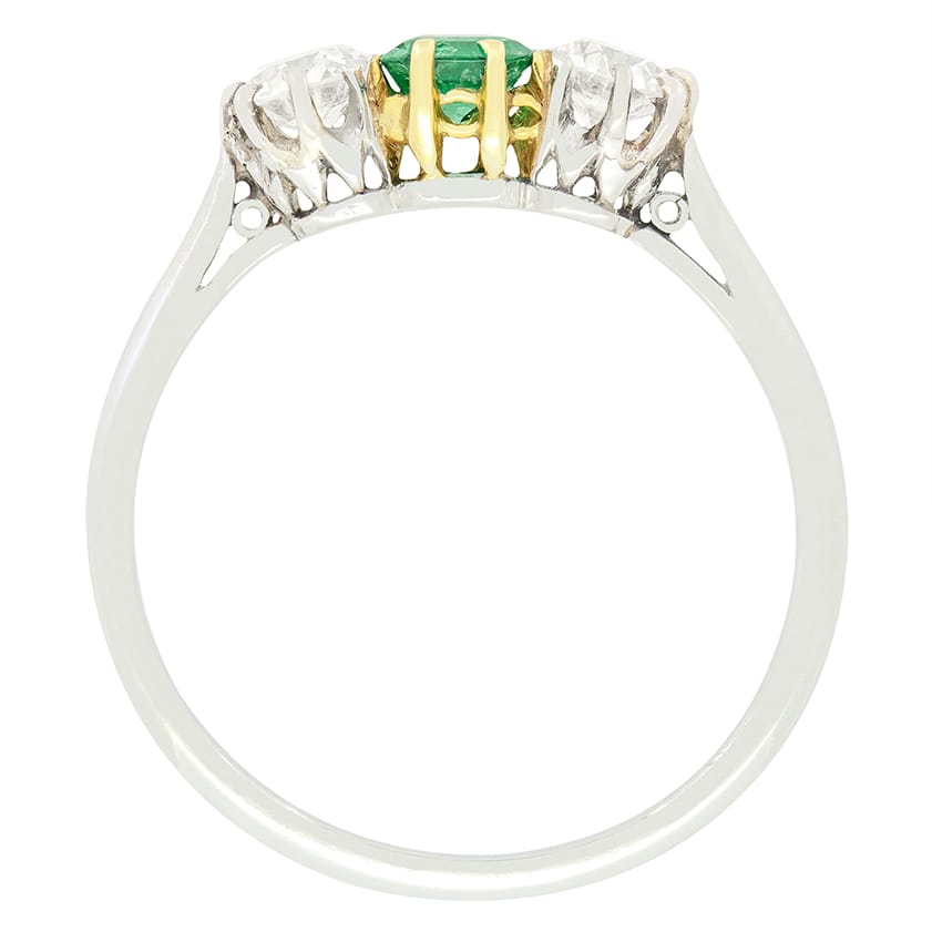 This Art Deco trilogy ring features a central vibrant emerald flanked by two wonderful old cut diamonds. The Emerald is a completely natural stone weighing 0.50 carat and is cut in the classic emerald cut style. Each of the diamonds weighs 0.40 carat and matches in quality at G in colour and VS1 in clarity. The emerald has been claw set in an 18 carat yellow gold collet, setting it apart and amplifying its beautiful green hue. The diamond pair have both been set into platinum, the same metal as the band.
