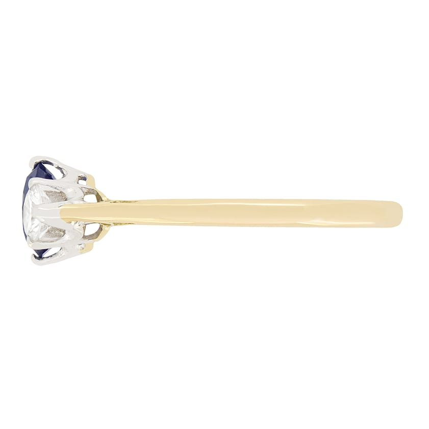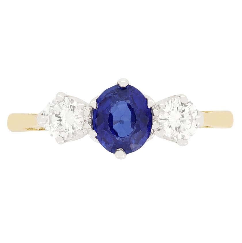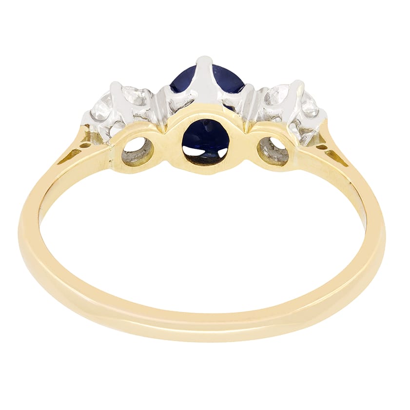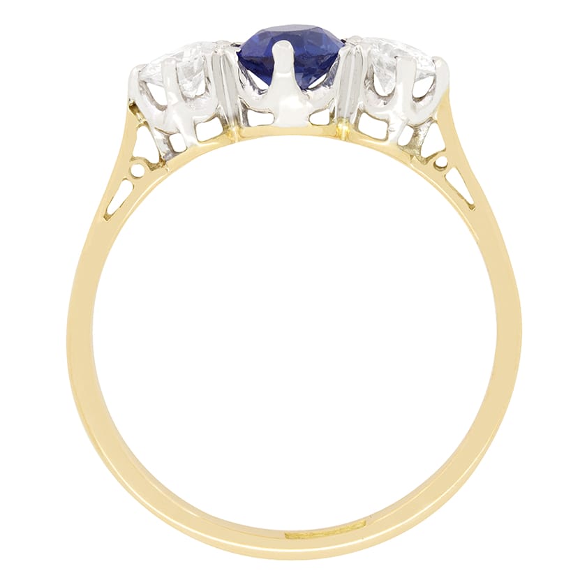 This beautiful trilogy ring dates back to the Art Deco period. The oval cut central sapphire has a carat weight of 0.50 carat and is flanked by a pair of 0.25 carat round brilliant diamonds. The diamonds have an estimated grading of F in colour and VS in clarity. All three stones are firmly claw set into in the platinum collet which is expertly attached to the 18 carat yellow gold band.