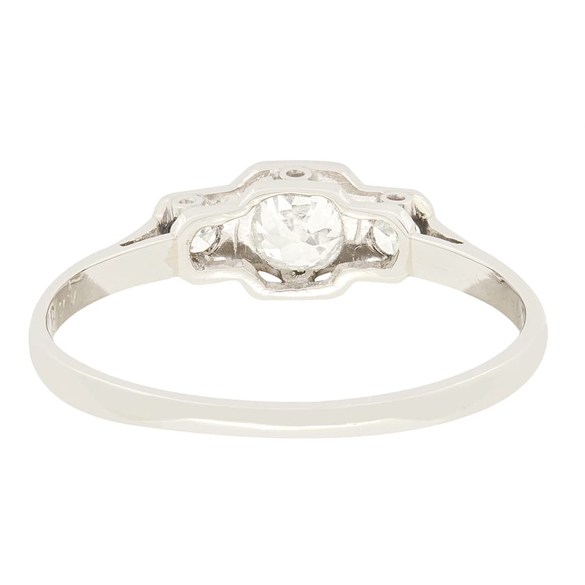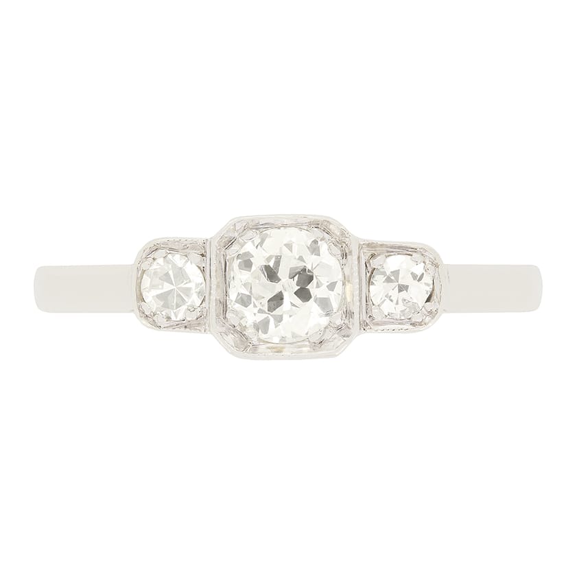 This charming Art Deco trilogy ring features three sparkling old cut diamonds. The central weighing 0.35 carats, flanked by two diamonds of 0.10 carats each. The diamonds are estimated to be G in colour and VS1 in clarity. The stones are claw set in a striking geometric platinum mount, a classic aesthetic of the Art Deco period. A beautiful 1920s take on the timeless three stone ring.