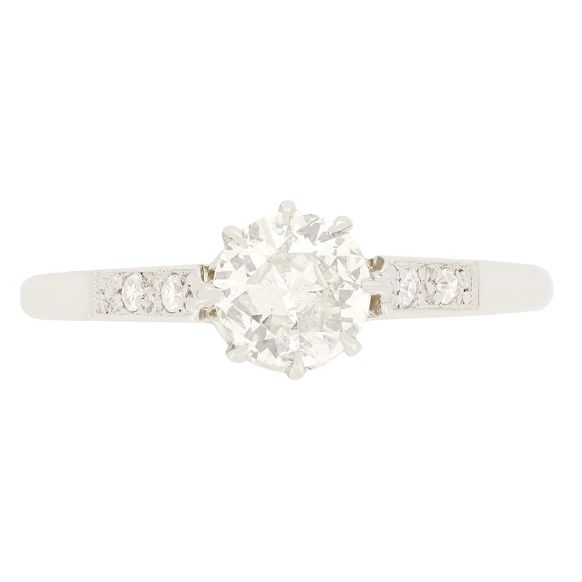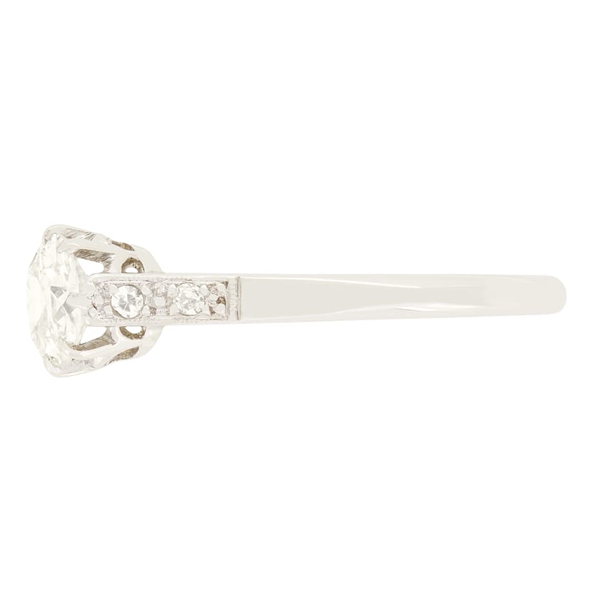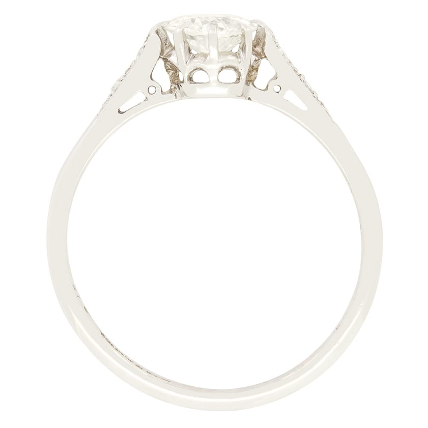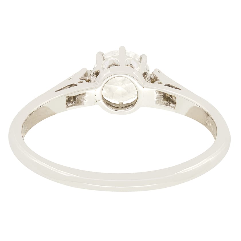 A beautiful old cut diamond takes centre stage in this sparkling Art Deco solitaire ring. The claw set stone weighs 0.60 carat, with a colour of I and clarity of SI2. Down each shoulder, an additional two diamonds are set, totalling 0.04 carat and matching the centre in quality. The central diamond has been claw set into an open platinum collet, allowing the stone to look its absolute best, with a band of18 carat white gold completing this timeless piece.