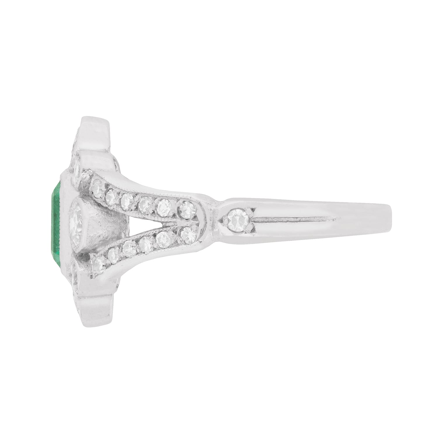 This art deco ring dates back to approximately the 1940s and features a sea green emerald in the centre, weighing 0.70 carat. It is set within an 18 carat white gold rub over setting. In the halo which surrounds the emerald, there are four diamonds in each corner, and four at each cardinal point. They have a combined weight of 0.60 carat and are also rub over set, to match the centre stone. The spilt shoulders are also diamond studded, totalling 0.28 carat and are eight cut diamonds. All the diamonds on this hand crafted ring are estimated to be G in colour and VS in clarity. It is a beautiful dress ring, and all made of 18 carat white gold.