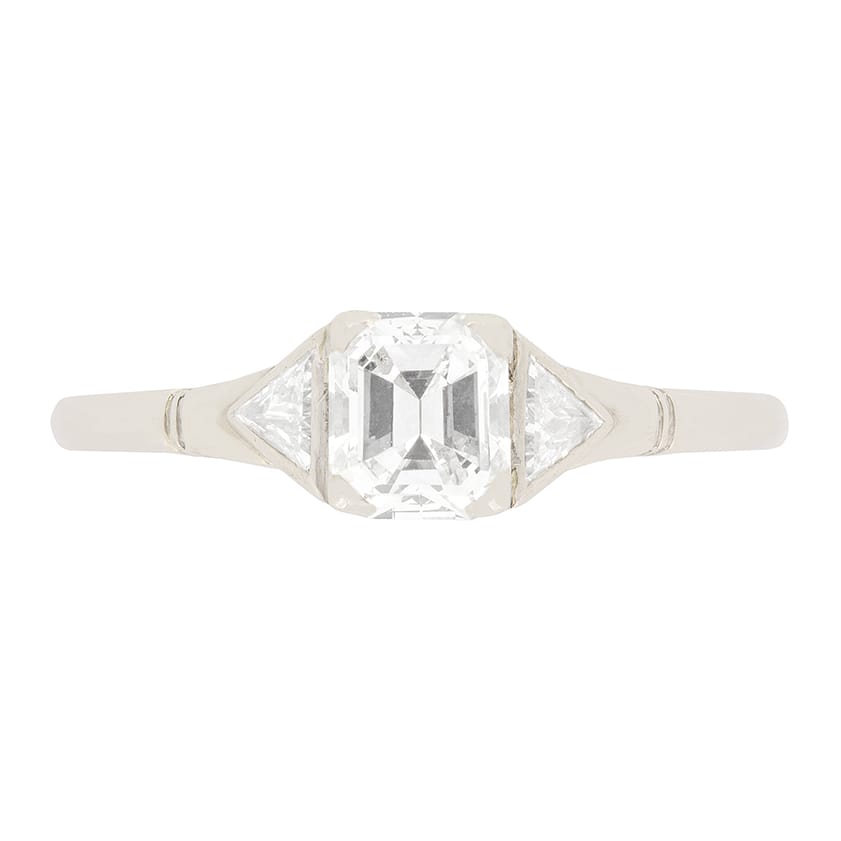 This Art Deco solitaire ring features a wonderful emerald cut diamond in its centre. Weighing 0.71 carat and graded F in colour and VS in clarity, this stone is of high quality. Two trillion cut diamonds accent the central stone, both of which weigh 0.10 carat and match the central diamond in quality. The tapered shoulders feature line detailing as a finishing touch. The ring is hand crafted from platinum.