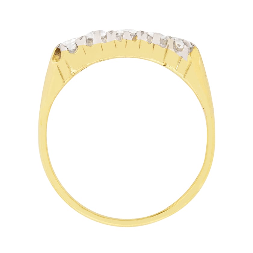 Five old cut diamonds are set in this 1920s five stone ring. The diamonds have a clarity of VS2 and are an excellent F colour. The handmade nature of this piece is admirable. The top of the setting work is made from platinum, to highlight the excellent colour of the diamonds and really make this delicate little ring shine. The band is made of 18 carat yellow gold.