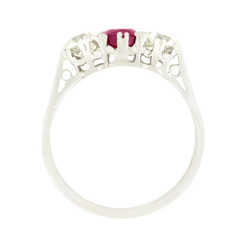 A natural, unheated ruby sits central in this beautiful Art Deco trilogy ring. The stunning ruby has a carat weight of 0.75 and is oval cut in shape. Contrasting either side are a pair of sparkling old cut diamonds which have a combined weight of 0.80 carat. Matching in quality, they have been graded as G in colour and VS1 in clarity. Each stone has been delicately double claw set in platinum with a band of 18 carat white gold completing the ring.