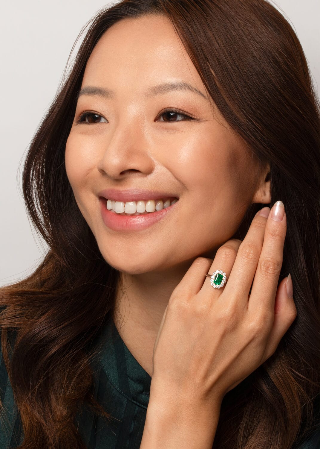 A vivid green emerald 0.80 carat takes centre stage in this Art Deco cluster ring. The classically emerald cut cut stone is fully natural and of Columbian origin, lending to it’s vibrant colouring. Surrounding the emerald, a total of 0.88 carat of old cut diamonds contrasts the central stone beautifully. The diamonds are of high quality, each stone matching at F in colour and VS in clarity. Fully crafted by hand the ring is predominantly made in platinum, with the emerald claw set in 18 carat yellow gold, contrasting wonderfully against the intense green of the stone.