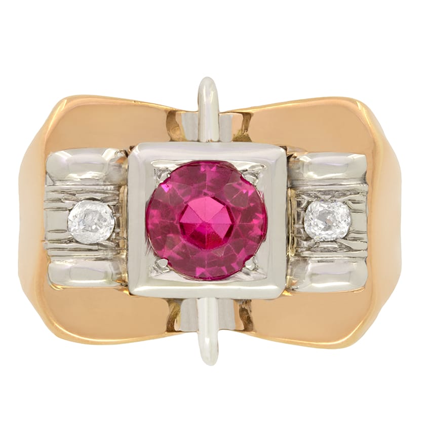 A bold and distinctive 1920s ring featuring a colourful pink sapphire in the centre and two old cut diamonds flanked on either side. The pink sapphire which weighs 0.80 carat is set within a square platinum collet with the diamonds being set in curved platinum collets. The diamonds weigh 0.20 carat combined and have been estimated as H in colour and SI in clarity. The remainder of the ring has been crafted in 18ct yellow gold.
