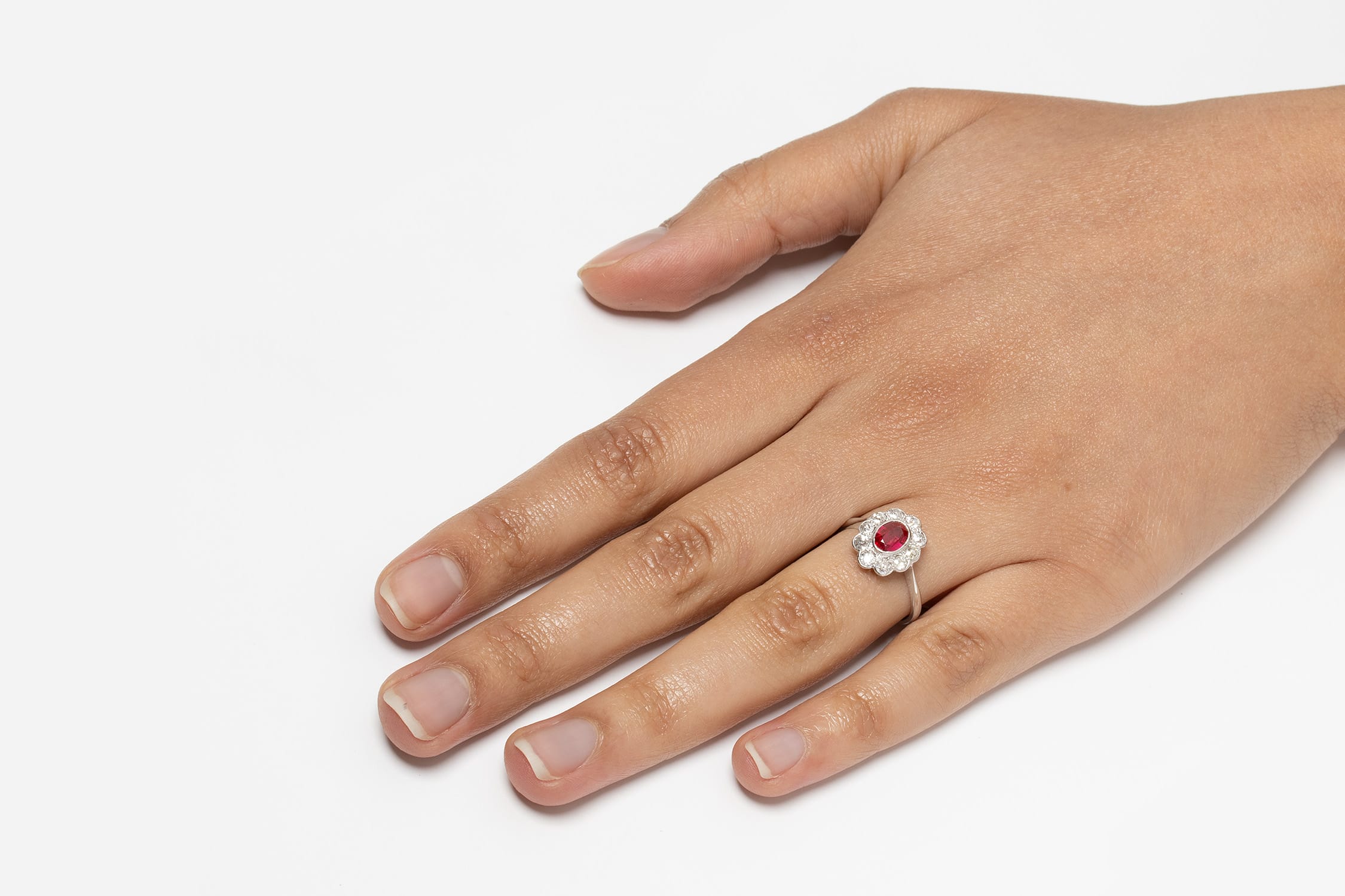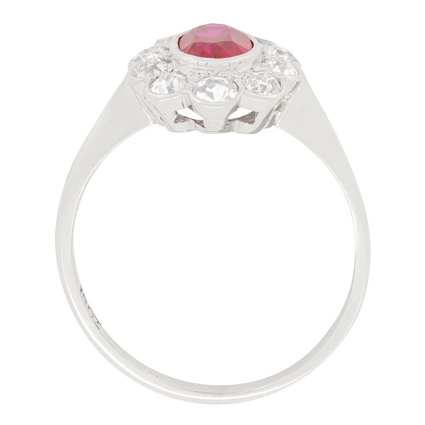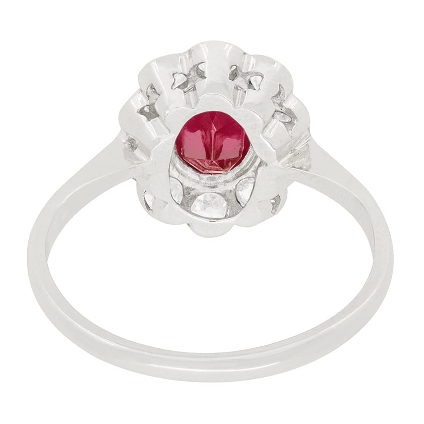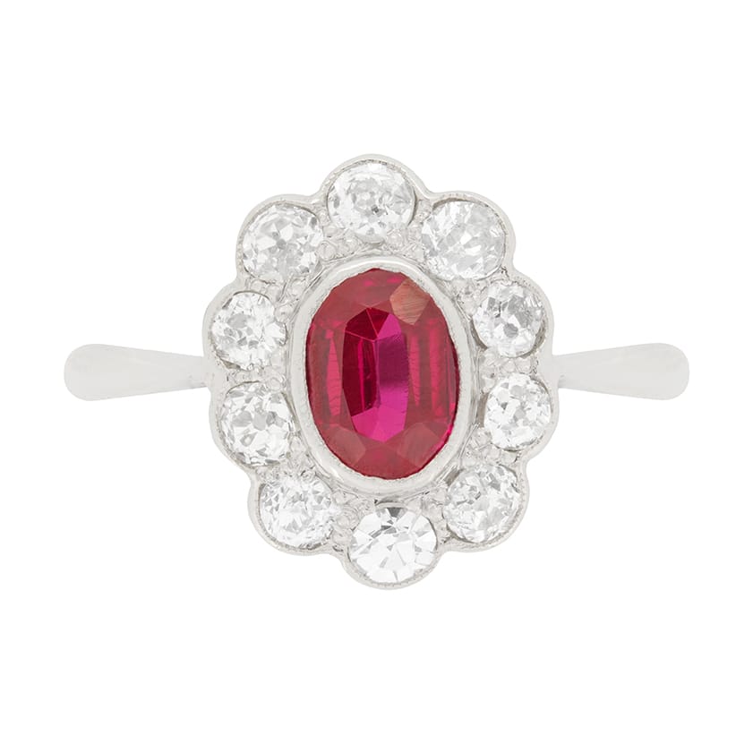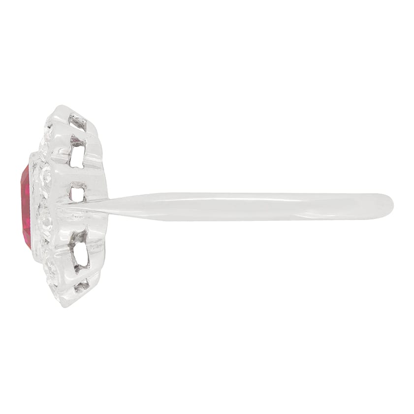 A fabulous natural red ruby proudly stands out in this dazzling 1920s cluster ring. Surrounding is a daisy style halo composed of ten old cut diamonds totalling to 0.50 carats. They are all of matching quality, being estimated as H in colour and SI in clarity. A tapered slim band made of 18ct white gold finishes off this Art Deco ring.
