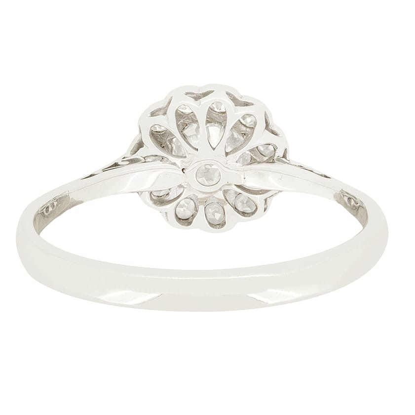 Eleven sparkling old cut diamonds encircle a central 0.50 carat old cut diamond in this Art Deco cluster ring. The surrounding diamonds total to 0.33 carat, with each stone matching in quality at G in colour and VS2 in clarity. All diamonds have been set in platinum, truly showcasing their beauty. A slim band, of 18ct white gold completes the ring in perfect Art Deco Style
