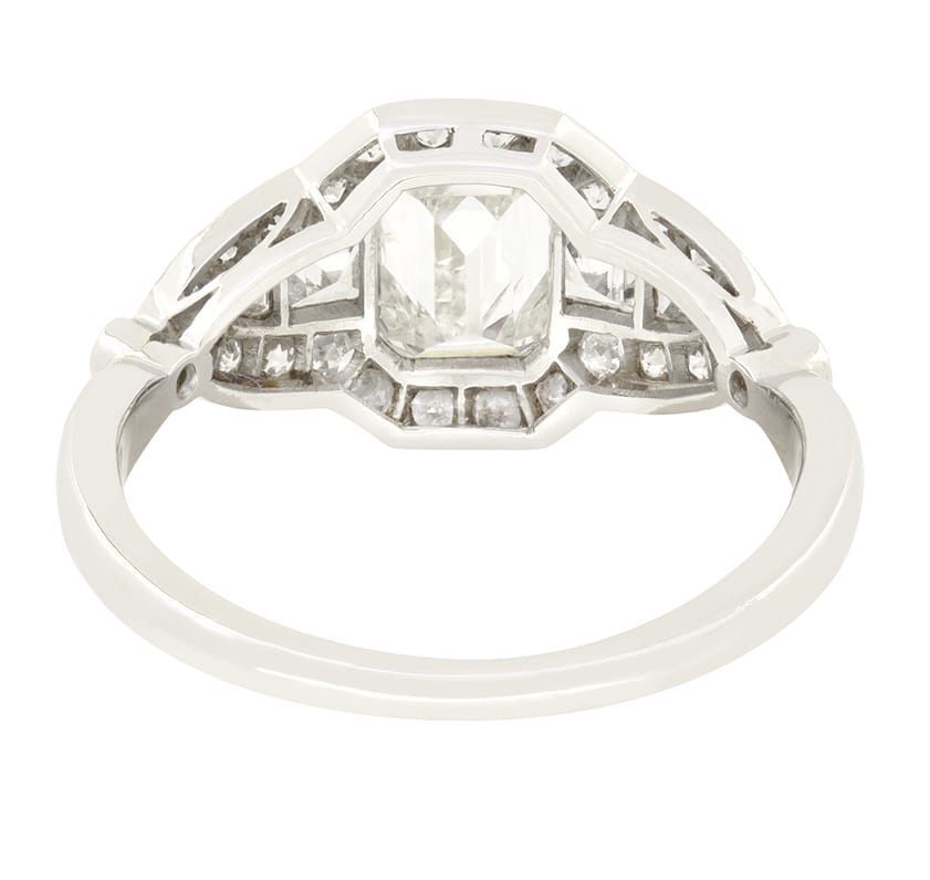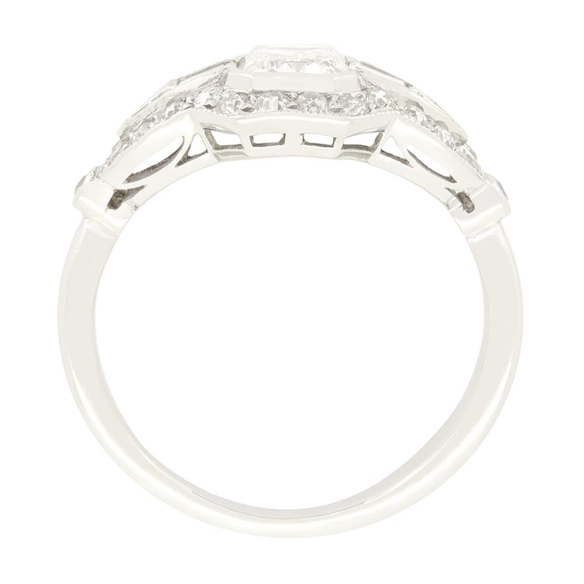 This cluster ring dates back to the 1920s and is iconically Art Deco in its design. At its centre a 0.90 carat emerald cut diamond is set, graded H in colour and SI2 in clarity. Flanking the centre stone are two carre cut diamonds of 0.20 carats each and two trillion cut diamonds of 0.10 carats each. Encircling the design is a halo of old cut diamonds, totalling 0.52 carats. These diamonds are of G to H in colour and VS clarity. Meticulously hand crafted in platinum, this ring embodies the intricate detailing and symmetrical style of the Art Deco era.