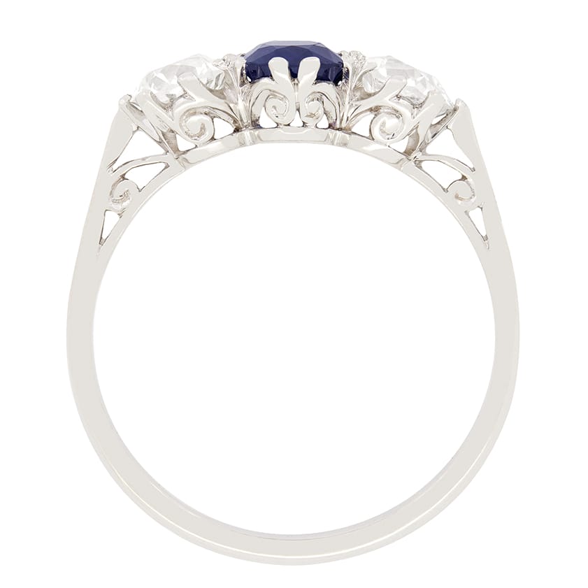 This beautiful Art Deco Trilogy ring showcases a vivid blue sapphire flanked by a pair of old cut diamonds. The central sapphire is a 0.90 carat oval cut and is completely natural and unheated. The flanking diamonds are 0.65 carat a piece and are of high quality, being graded G in colour and VS2 in clarity. Intricately carved metalwork features along the side of the gallery and down to the shoulders. Entirely crafted from platinum, this ring is a divine 1920s take on the timeless three stone design.