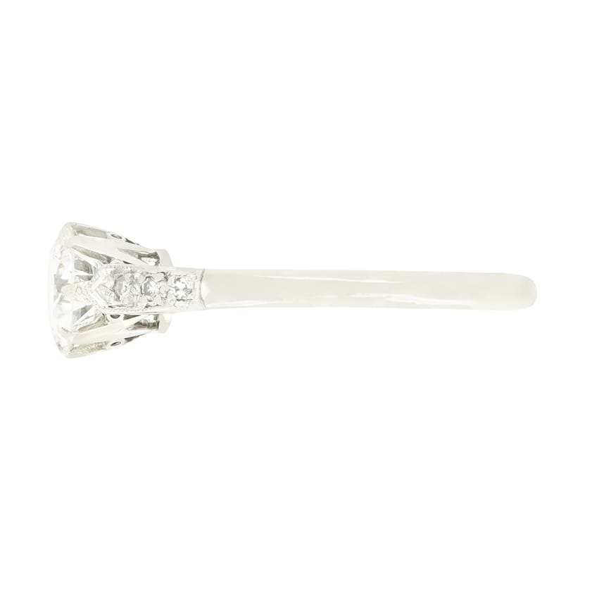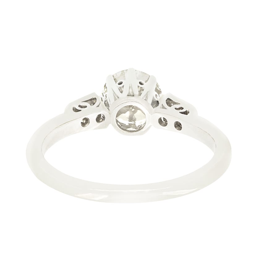 This Art Deco take on the timeless solitaire engagement ring features a stunning old cut diamond at its centre. Weighing 0.92 carat the diamond is of high quality, with colour of F and clarity of VS1. The diamond has been claw set into a classic platinum collet. Down each shoulder an additional three eight cut diamonds are sat totalling a further 0.06 carat, with a band of 18 carat white gold completes the piece.
