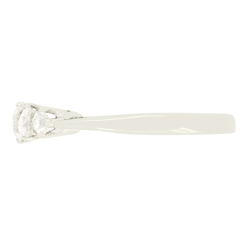 Five sparkling old cut diamonds take pride of place in this Art Deco ring. The central diamonds sits the biggest weighing 0.35 carat, the two flanking stones are 0.20 carat, with the two end diamonds being 0.10 carat a piece They range in colour from G to H and match in clarity at VS2. Each stone is set within hand crafted 18 carat white gold collets with a band of the same metal completing the piece in classic 1920s style.