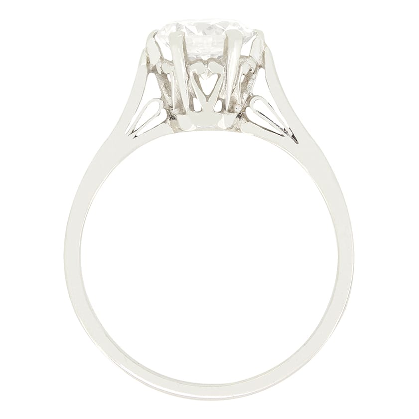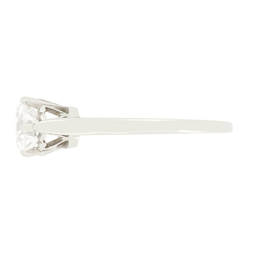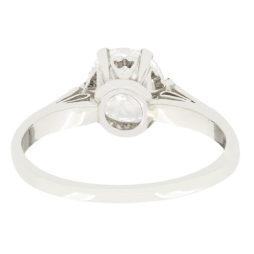 This classic Art Deco solitaire ring showcases a sparkling old cut diamond at its centre. The diamond weighs 0.95 carat and is of good quality with a colour of H and clarity of VS1. Crafted entirely in platinum, the centre stone is elegantly held within a simple claw setting and sat upon a clean band, allowing the diamond to take centre stage.