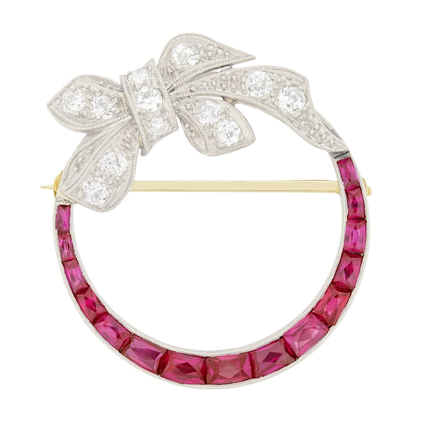 This lovely art deco brooch features a ring of french cut rubies adorned with a diamond bow. The raspberry red rubies would have been cut by hand to perfectly fit within the setting, and total to 1.50 carat. A diamond set bow is draped on the top half of the wreath, the diamonds are old cut and total to 1.00 carat. They are G colour and VS clarity. The gems are all set in platinum, while the back of the brooch is made of 18 carat yellow gold.