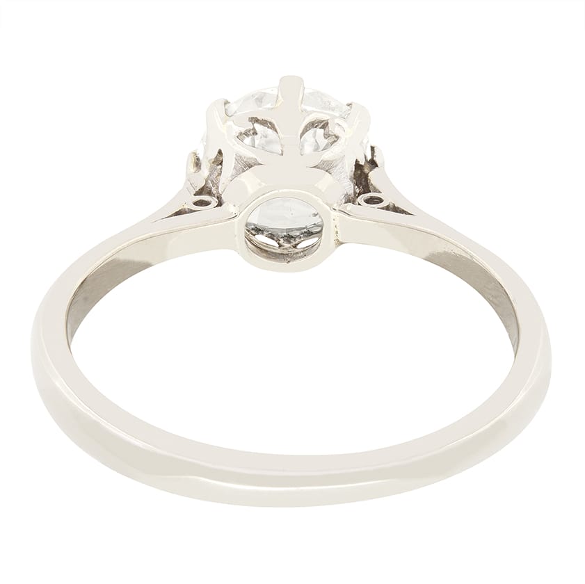 Centred around a carat sparkling 1.00 carat old cut diamond, this beautiful Art Deco solitaire is a timeless classic. Claw set into a platinum collet, the Diamond has a grading of I in colour and VS2 in clarity. A hand crafted 18 carat white gold band tapers gently from the basketwork, finishing the ring off perfectly in keeping with the time period.