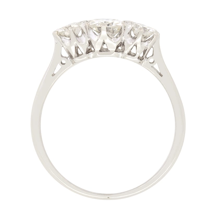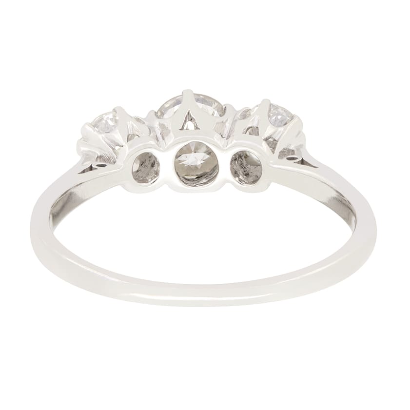Timeless elegance is on display in this classic trilogy ring. Dating back to the 1930s, this ring features a trio of transitional cut diamonds. The central of the three sits the largest at 0.50 carat whilst the flanking pair are 0.25 carat a piece. The stones range in colour from G to H but match in clarity at VS2. Platinum collets hold each of the diamonds gently in claw settings, whilst the band is crafted in 18 carat white gold.