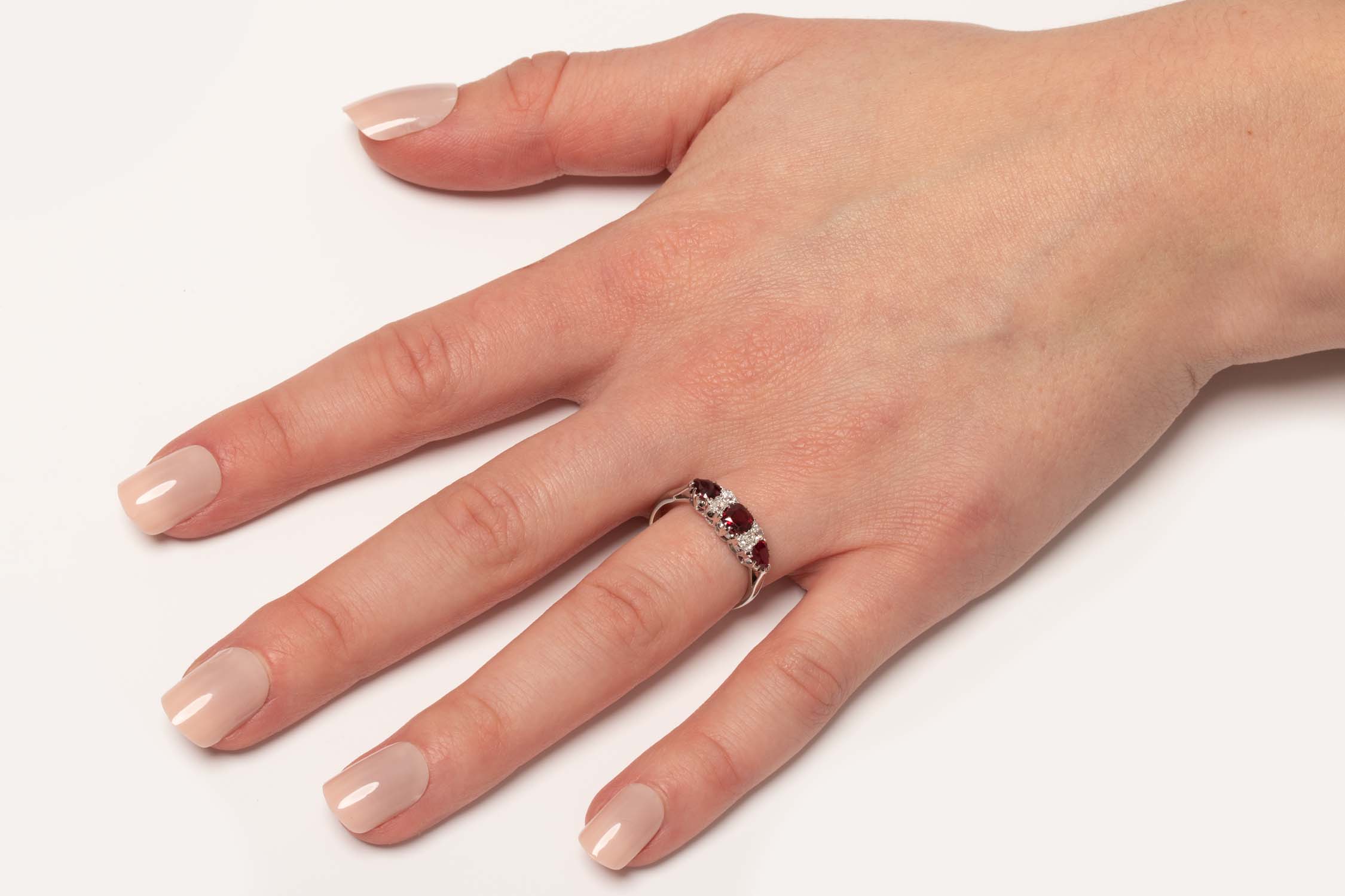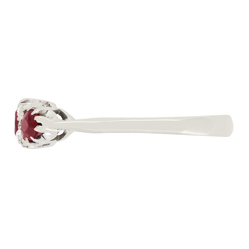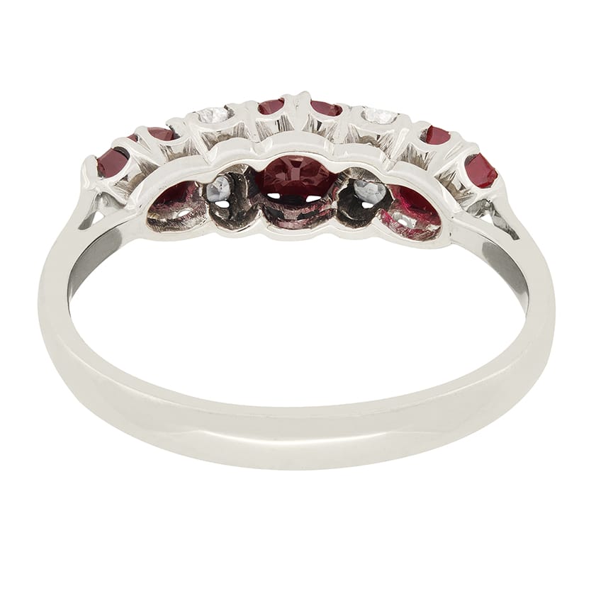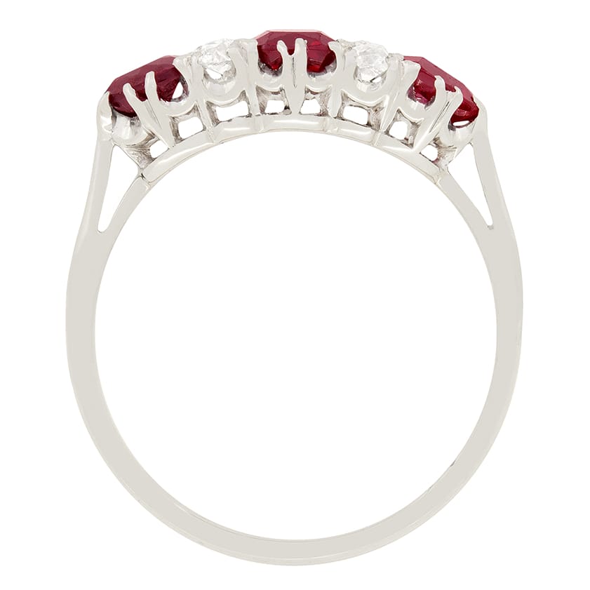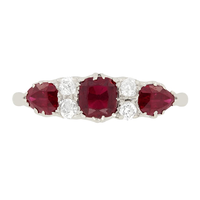 An admirable 1920’s ring set with alternating rubies and diamonds. The central ruby weighs 0.50 carat and is cushion shaped with the two outer rubies weighing 0.25 carat each and are pear shaped. Set between the rubies are two old cut diamonds either side, totalling to 0.20 carats. This lovely Art Deco ring has been hand crafted in 18ct white gold.